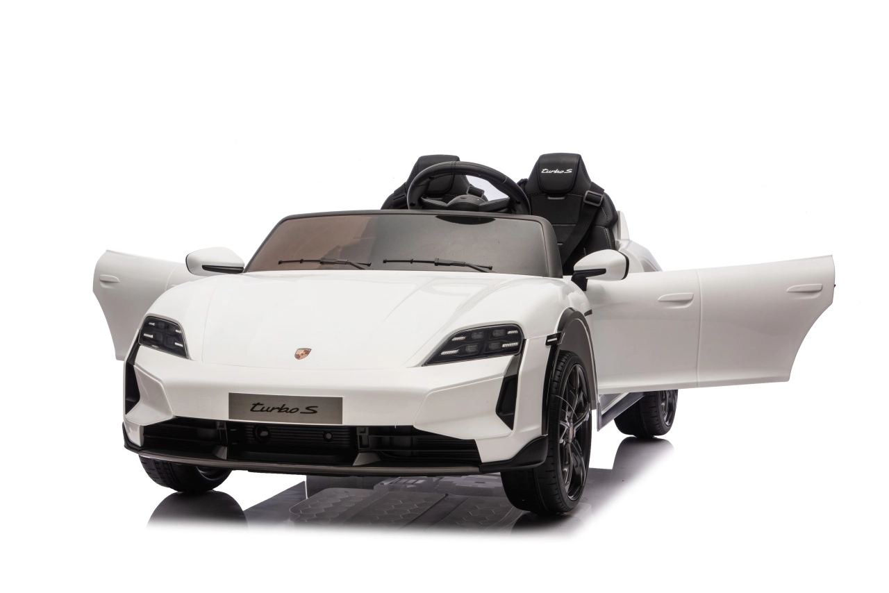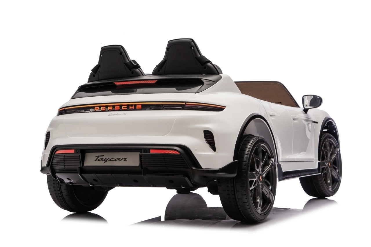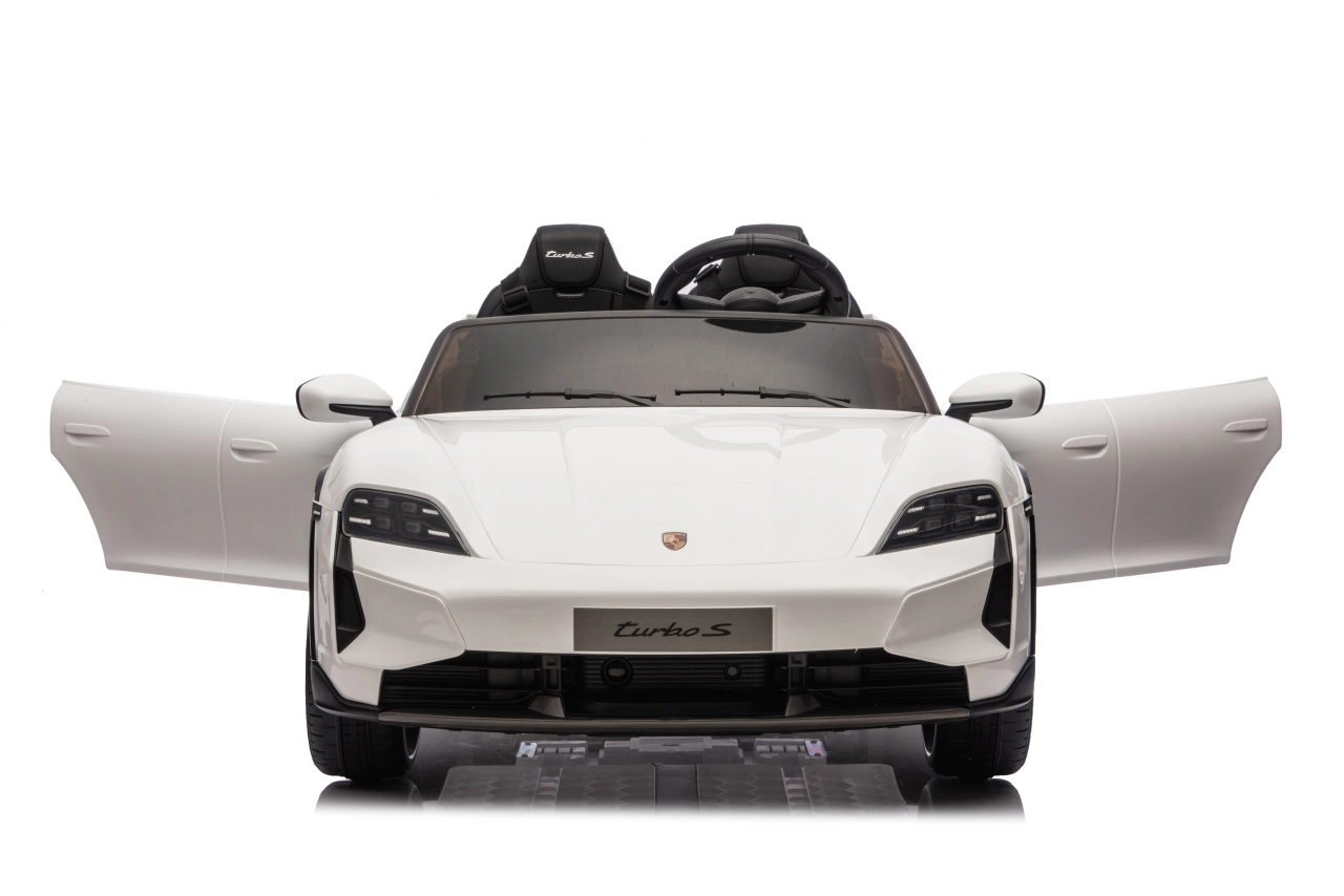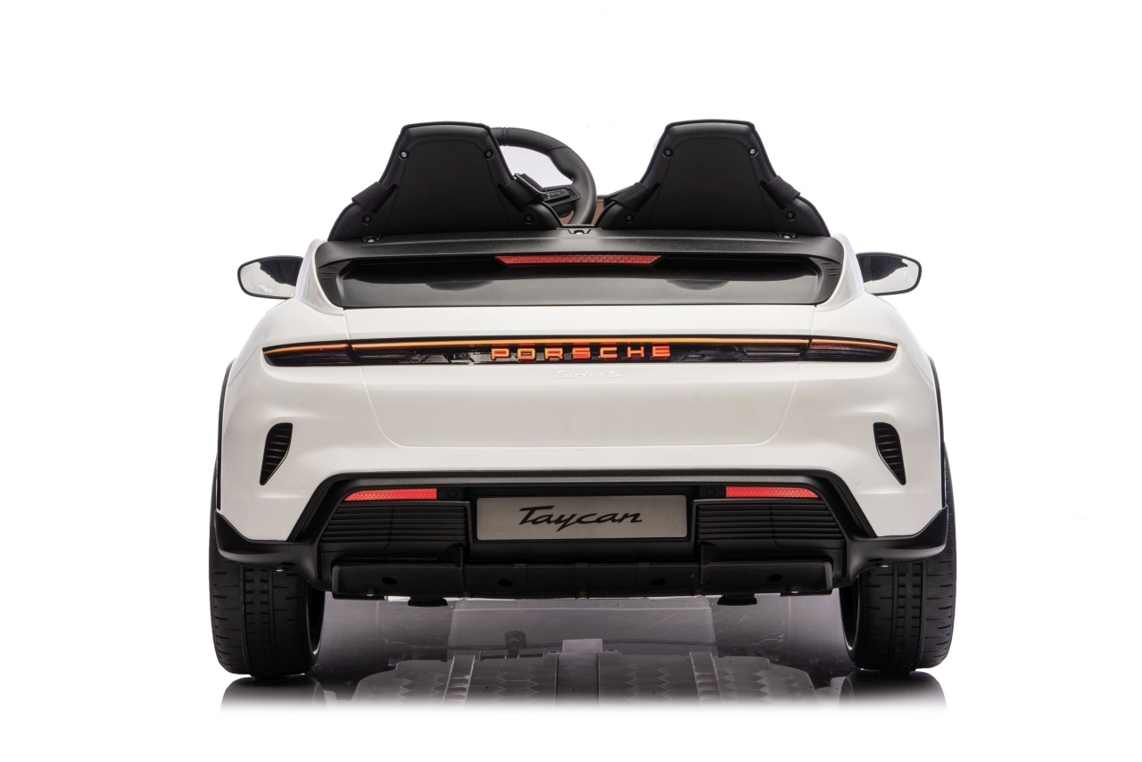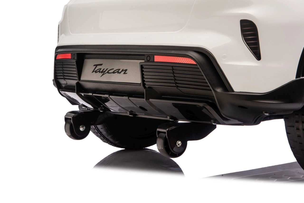 Stijlvolle elektrische kinderrit met officiële PORSCHE-licentie! De witte Taycan Turbo S biedt twee 90 W motoren, een 24 V 7 Ah accu, zachte EVA-wielen, openende deuren en een kunstlederen stoel met veiligheidsgordels. Ouders waarderen de 2,4 GHz afstandsbediening met Stop-functie, kinderen genieten van de LED-verlichting en het audiopaneel met MP3, FM-radio en Bluetooth.