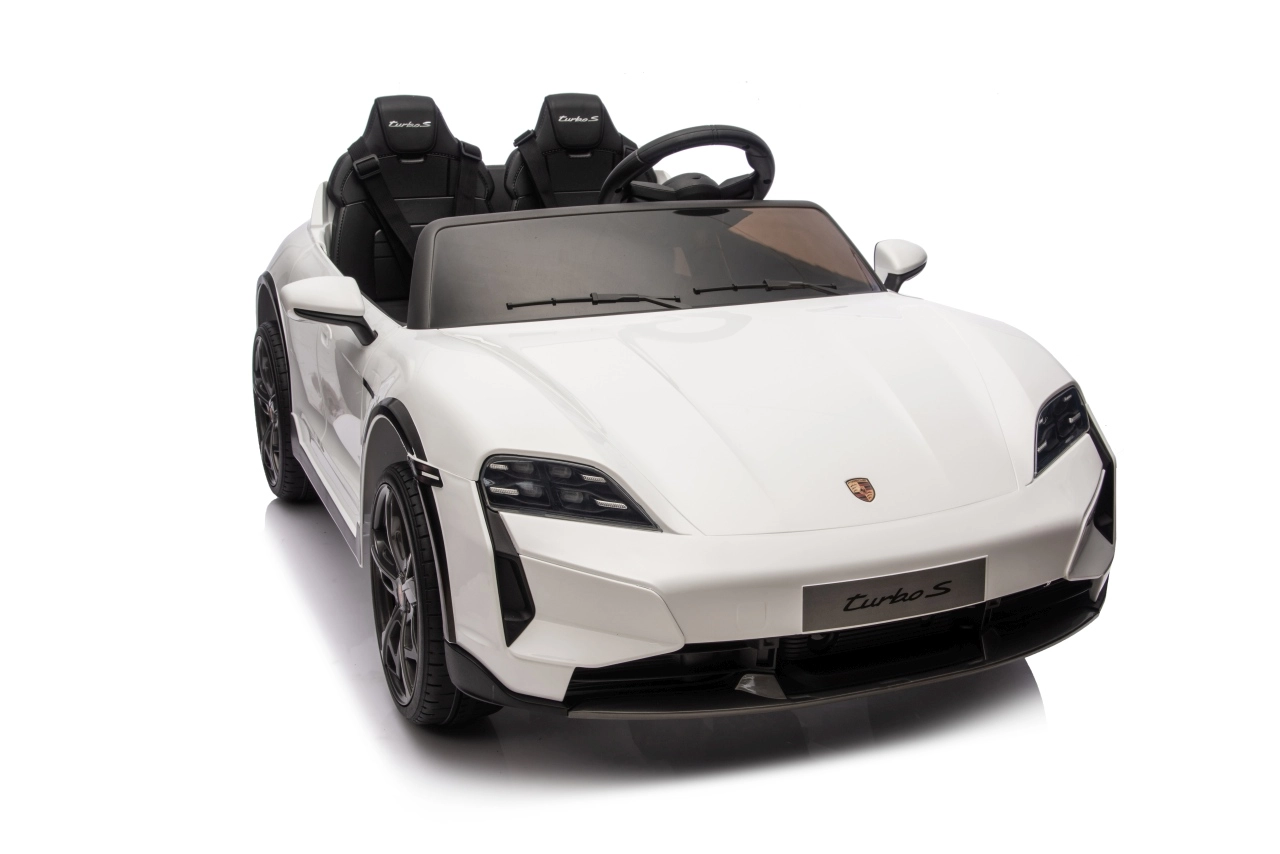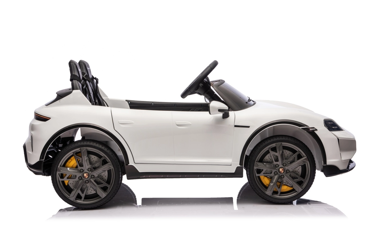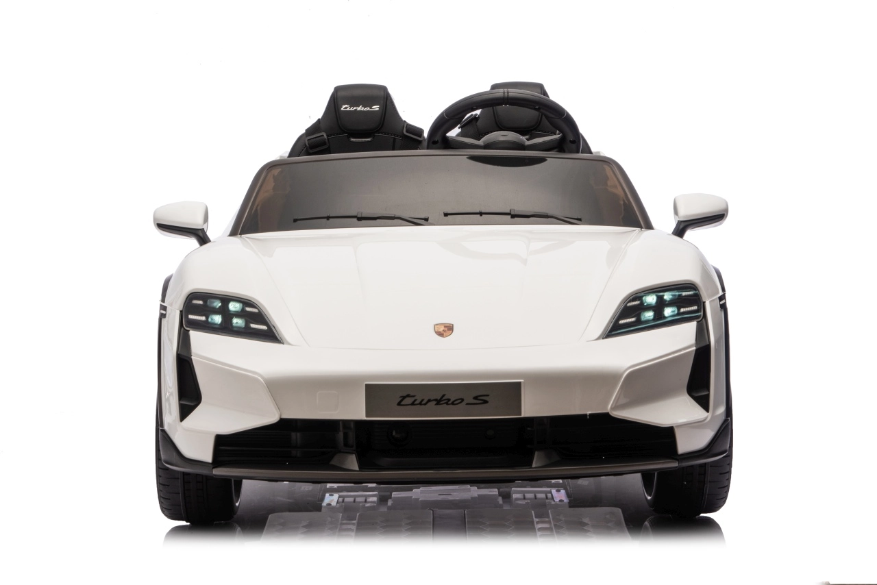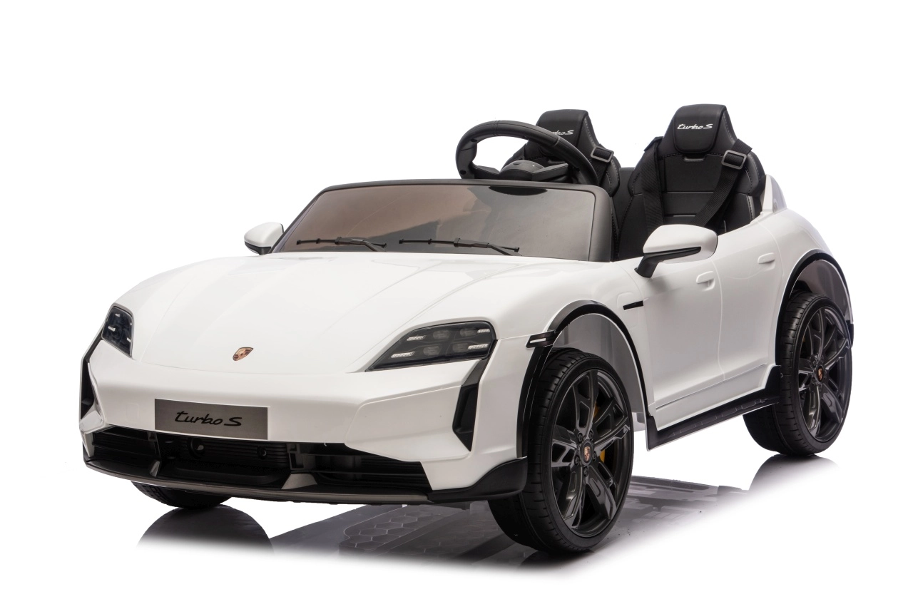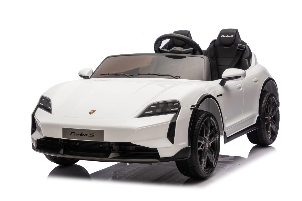 Stijlvolle elektrische kinderrit met officiële PORSCHE-licentie! De witte Taycan Turbo S biedt twee 90 W motoren, een 24 V 7 Ah accu, zachte EVA-wielen, openende deuren en een kunstlederen stoel met veiligheidsgordels. Ouders waarderen de 2,4 GHz afstandsbediening met Stop-functie, kinderen genieten van de LED-verlichting en het audiopaneel met MP3, FM-radio en Bluetooth.