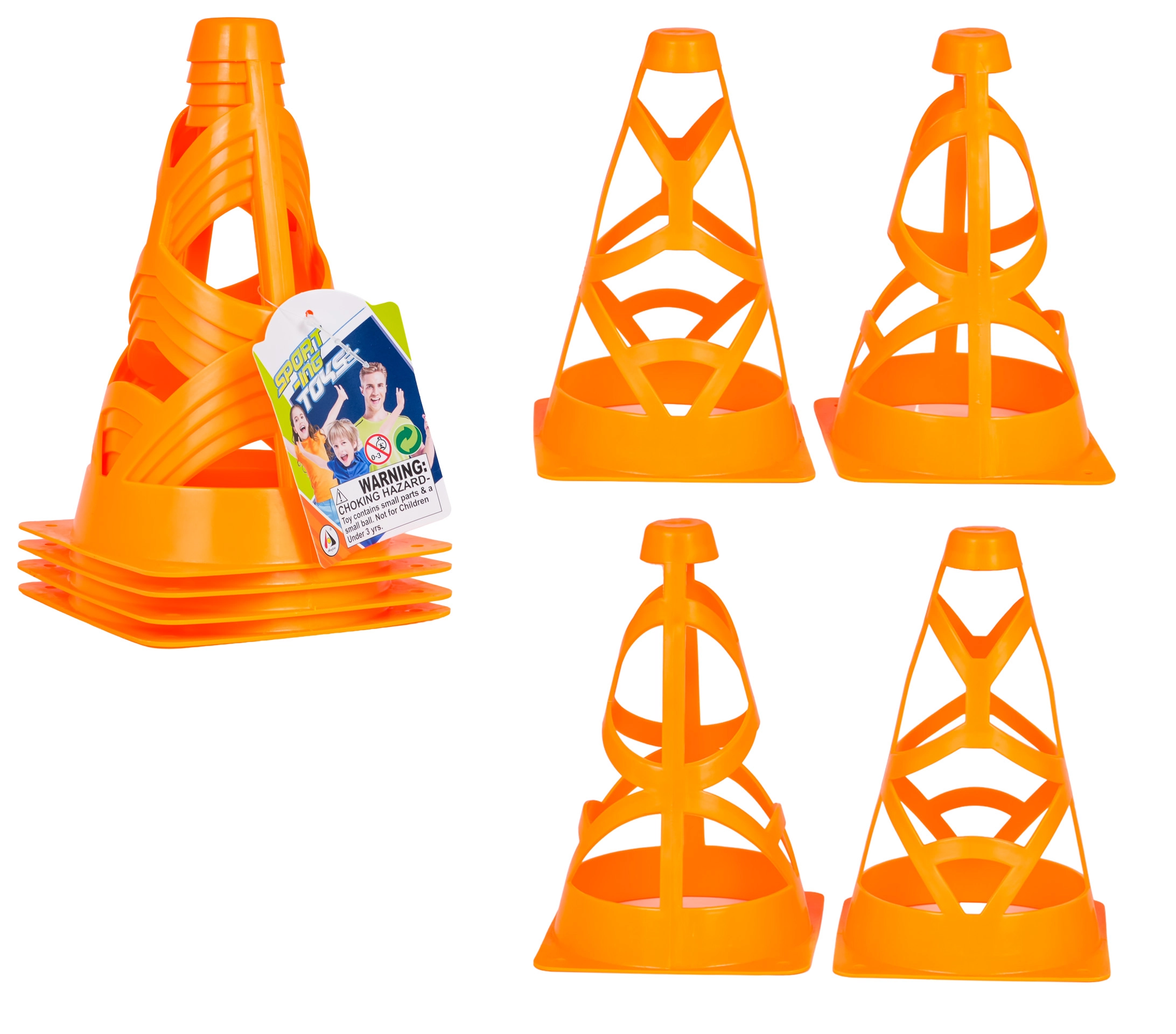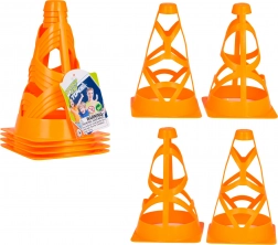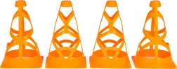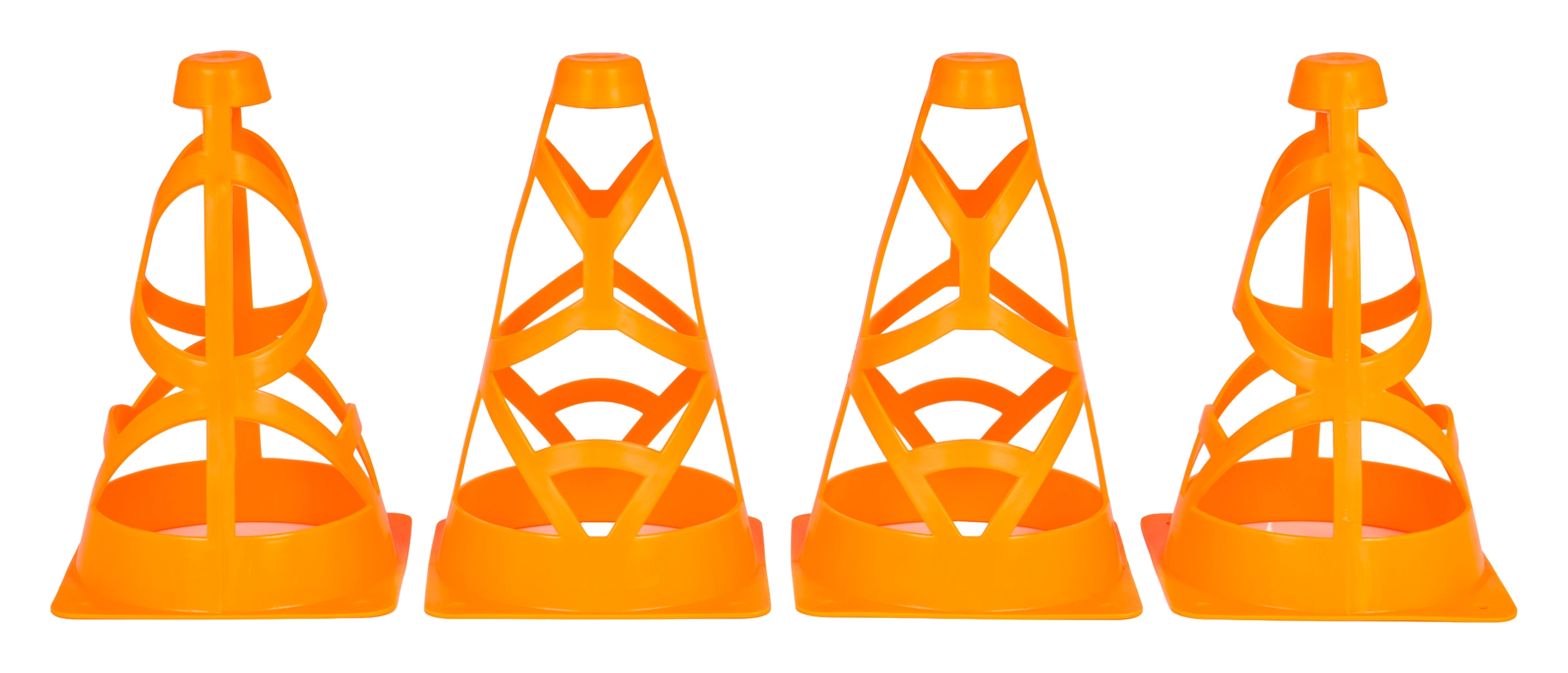 Set van vier oranje kegels voor kinderen vanaf 3 jaar en volwassen sporters. Ze zijn licht, stapelbaar en dankzij de heldere oranje kleur uitstekend zichtbaar. De open constructie met ankergaten zorgt voor stabiliteit, ook bij wind. Geschikt voor voetbaltrainingen, agility-oefeningen en het afzetten van zones op het veld of in de tuin.