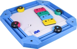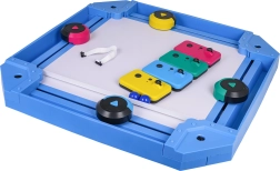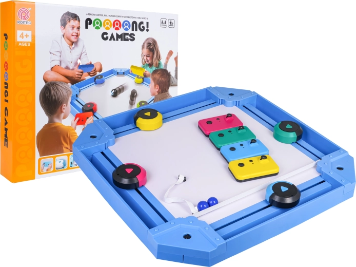 De robuuste kunststof arena met verhoogde randen houdt het spel onder controle; kleurrijke schijven en paddlemodule zorgen voor overzicht en flair. Spelelementen worden gevoed door 3,7 V-accu’s (inbegrepen), controllers gebruiken 2× AA 1,5 V batterijen (niet inbegrepen). Ideaal als cadeau en een geweldige keuze voor actief schermloos vermaak.