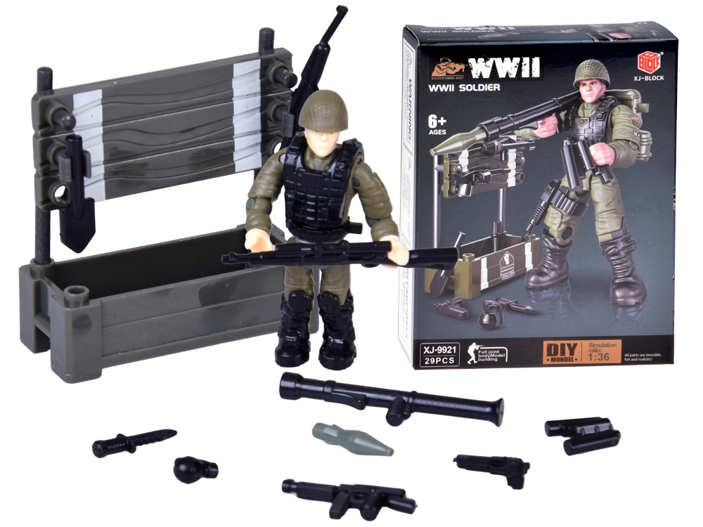 Deze compacte WOII-soldaat bouwset op schaal 1:36 biedt geweldig plezier voor zowel kinderen als verzamelaars. De onderdelen klikken eenvoudig in elkaar volgens de afbeeldingenhandleiding en binnen korte tijd maak je een figuur met veel details. Het voltooide model is stabiel en kan worden ingesteld in verschillende dynamische poses.