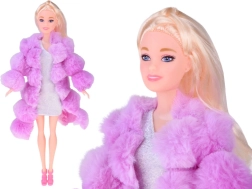 De pop met lang blond haar, glinsterende jurk en zachte roze/ paarse bontjas geeft het spel elegantie en creativiteit.