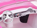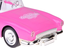 Stijlvolle roze retro cabrio met elegante pop biedt afstandsbediening, licht- en geluidseffecten en rijk accessoires. Kinderen zullen genieten van de cabrio met chromen details, de mogelijkheid om vooruit/achteruit te rijden en te sturen en ook de oplaadbare batterij met USB-opladen.