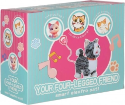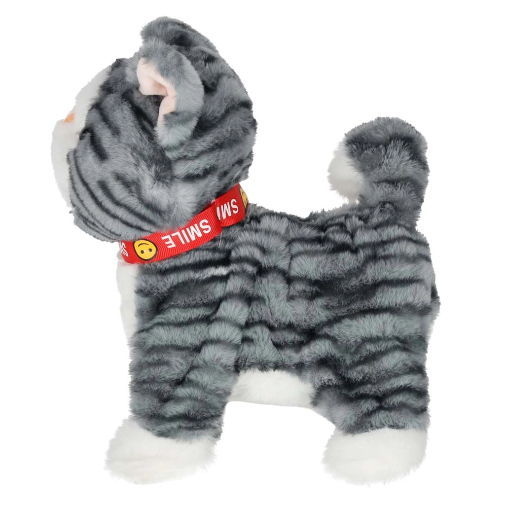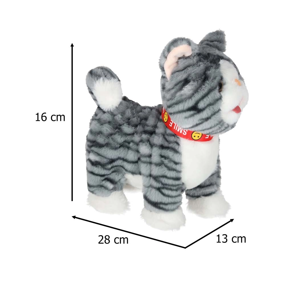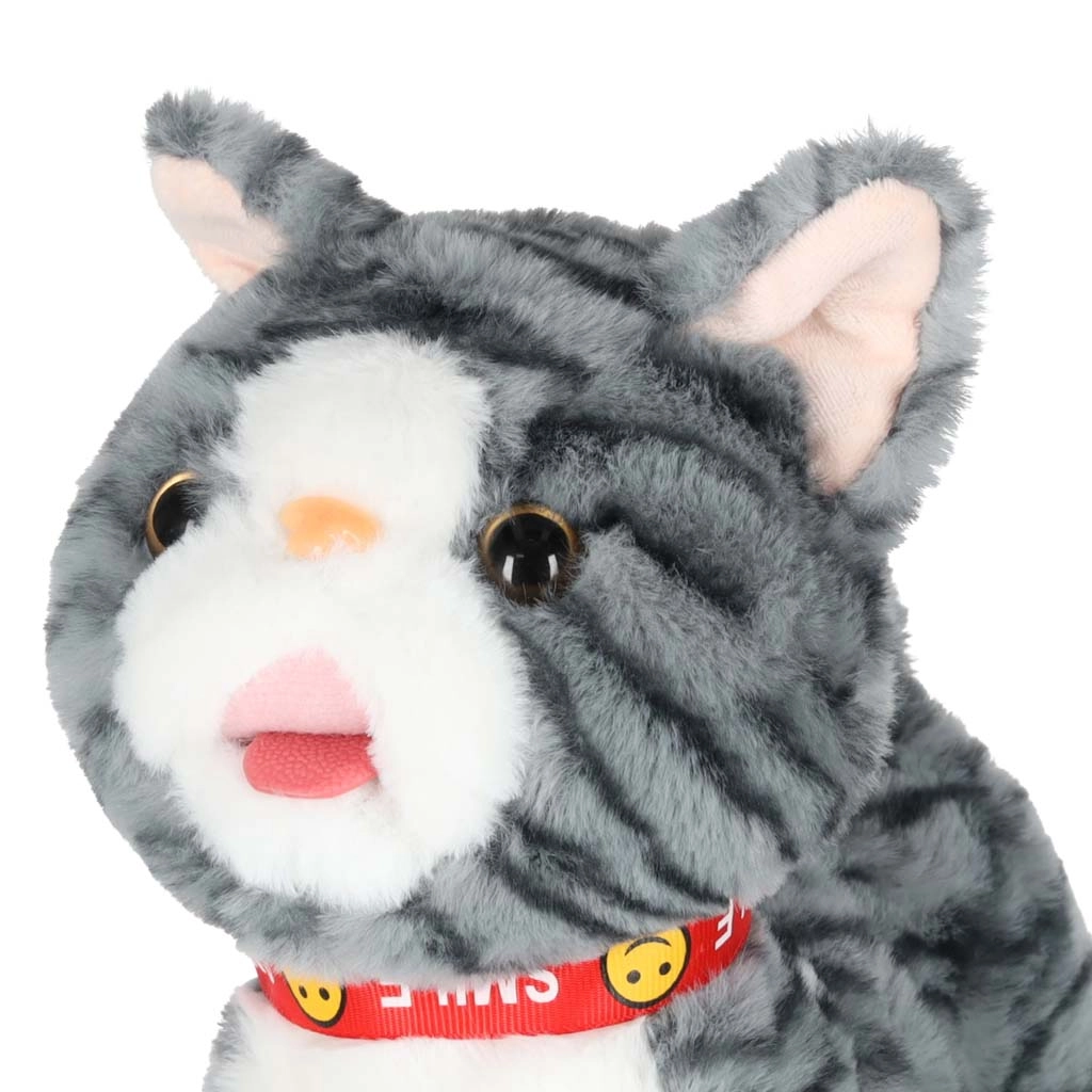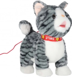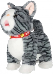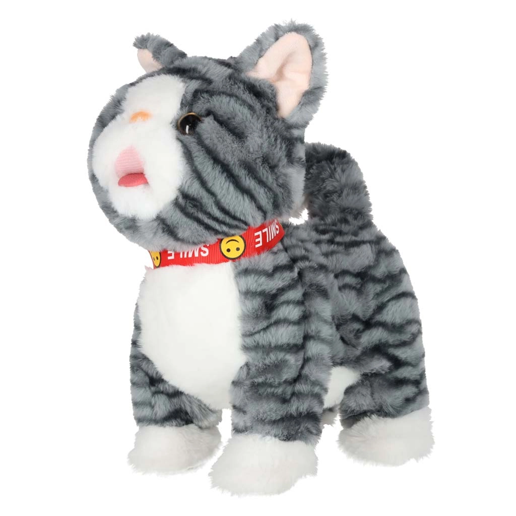 Een schattige interactieve pluchen kat aan een riem bezorgt kinderen uren speelplezier. Bij het indrukken van de knop loopt ze naar voren, miauwt, kwispelt met haar staart en beweegt haar tong. De zachte grijs gestreepte vacht nodigt uit om te knuffelen en het spel leert tegelijk zorg voor een huisdier. Ideaal cadeau voor kinderen vanaf 3 jaar.