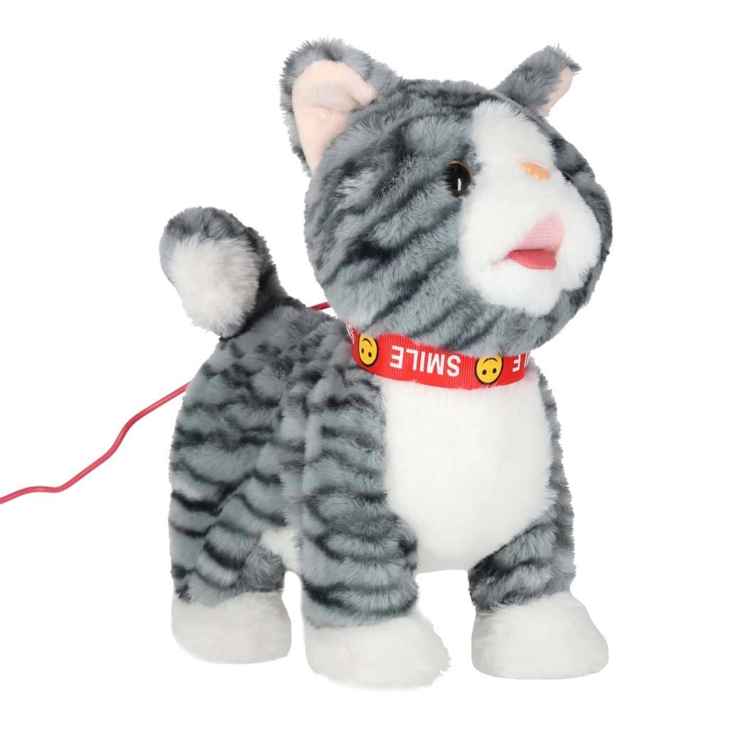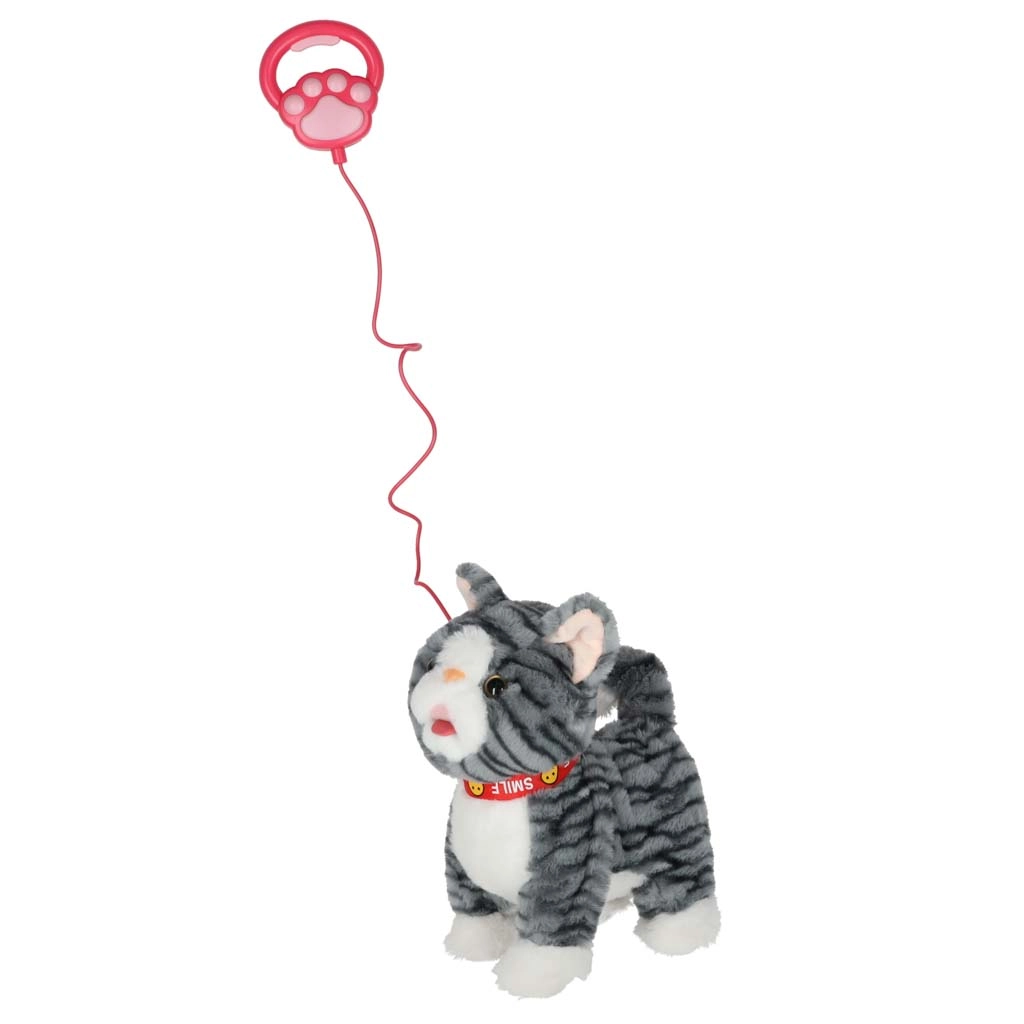 Interactieve pluche kat aan een riem – miauwt, loopt en kwispelt met de staart, grijs