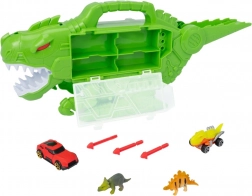 De Teamsterz Beast Machines speelset combineert de wereld van dinosaurussen en autootjes in één draagbare set. De grote plastic dinosaurus met realistische details – tanden, rode ogen en een getextureerde “huid” – verbergt binnenin een praktische opbergruimte voor een verzameling autootjes en een interne helling waarlangs voertuigen rechtstreeks uit de poten van de dinosaurus kunnen rijden.