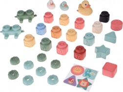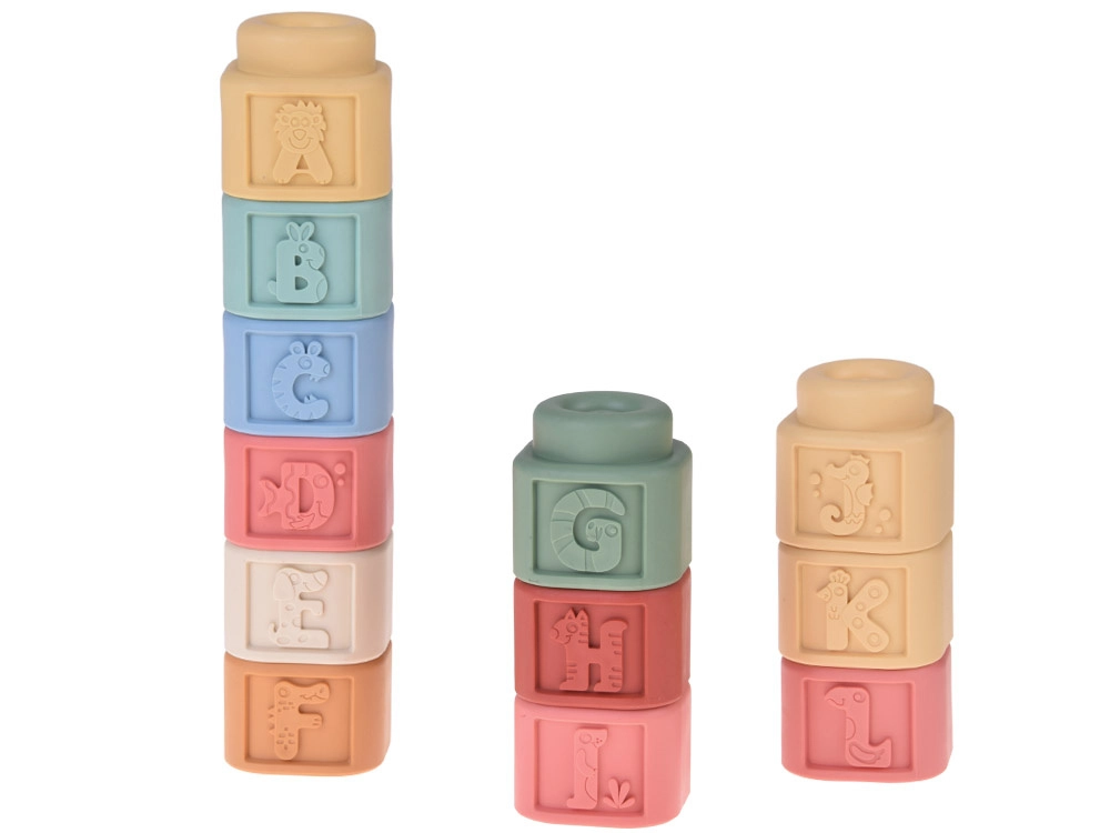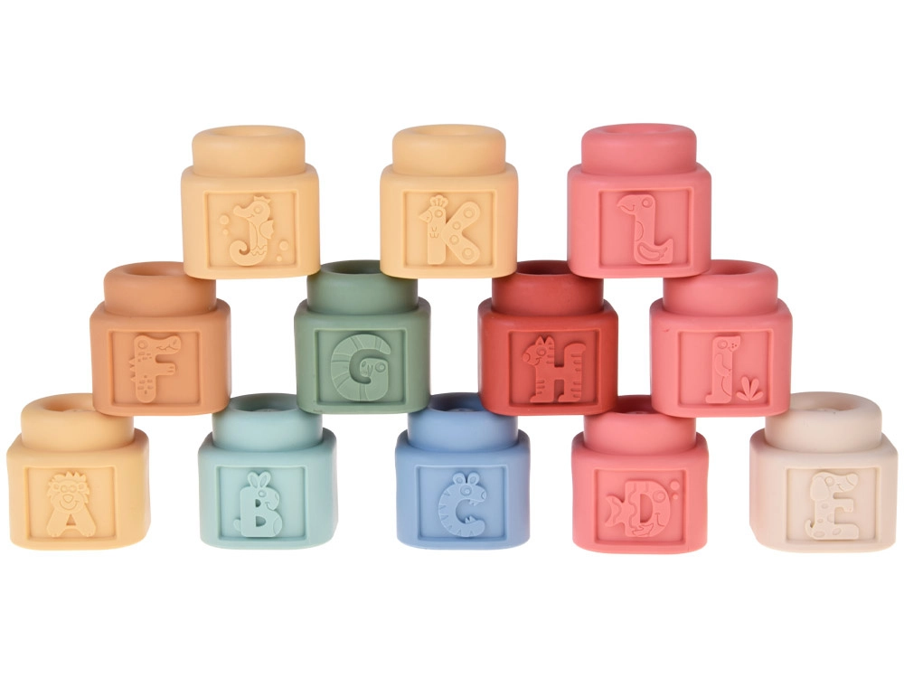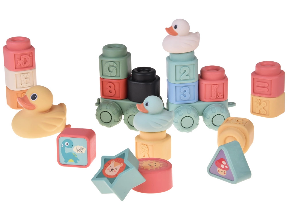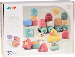 Leuke en veilige set voor de allerkleinsten: zachte pastelblokjes met reliëf van letters, cijfers en dieren, aangevuld met schattige bad-eendjes. Elastische en niet-giftige siliconen/rubber voelen prettig aan, ideaal voor kleine handjes en ook als bijtspeeltje. Stimuleert fijne motoriek, oog-handcoördinatie, het leren van kleuren, vormen en cijfers en biedt volop creatieve speelpret, zowel thuis als in het water.