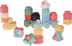 Dankzij de reliëfmotieven van letters, cijfers, dieren en vormen ontdekken kinderen speels de eerste begrippen, bouwen ze woordenschat op en ontwikkelen ze voorbereidende rekenvaardigheden. De set is ook geschikt voor in bad of zwembad – de onderdelen drijven, de eendjes zorgen voor plezier bij elk bad en de bouwdelen kunnen ook buiten het water gestapeld worden.
