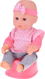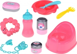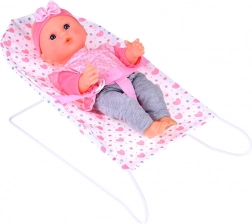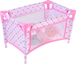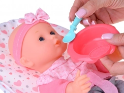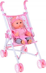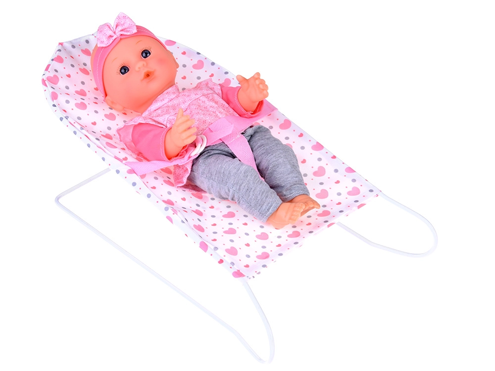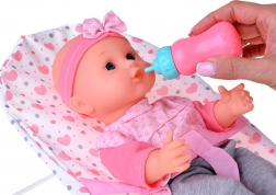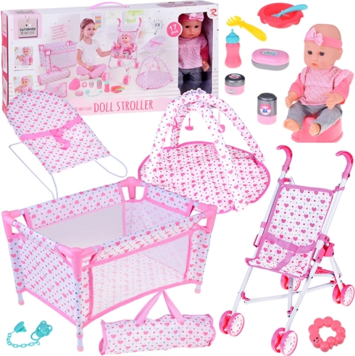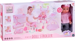 Verras kinderen met een doordachte verzorgingsset voor de pop. Inclusief een babypop met beweegbare ledematen en zachte outfit, een praktische reiswieg/reisbedje met hoes, een comfortabel wipstoeltje met veiligheidsgordel, een speelkleed met babygym en een inklapbare wandelwagen – “paraplu”. Verder: potje, fles, kom met lepeltje en vorkje, rammelaar, fopspeen aan kettinkje, “crème” en toilet-potjes en een accessoiretas.