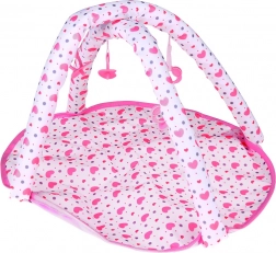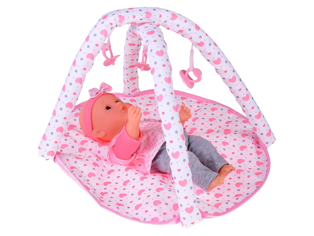 Een zacht, rond kleed met hangende speeltjes stimuleert de zintuigen en biedt een knus plekje voor spelen en rusten van de pop.