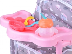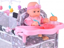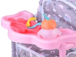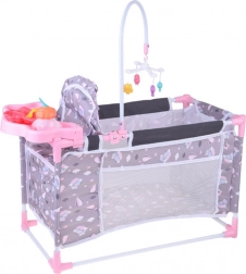 Schattige 2-in-1 poppenset combineert een ledikant met mobiel en een kinderstoel in één. Inclusief veel accessoires (fles, bordje, lepeltje, vorkje, mesje), zodat kinderen hun pop kunnen voeren, verzorgen en naar bed brengen. De stabiele metalen constructie, de zachte roze‑grijze kleurstelling en de accessoires voor realistisch spel stimuleren empathie, fijne motoriek en sociale vaardigheden.