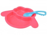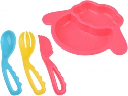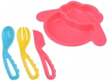 Inclusief kinderstoel en praktische set servies: bordje, lepeltje, vorkje en mesje – alles aangepast aan kinderhandjes.