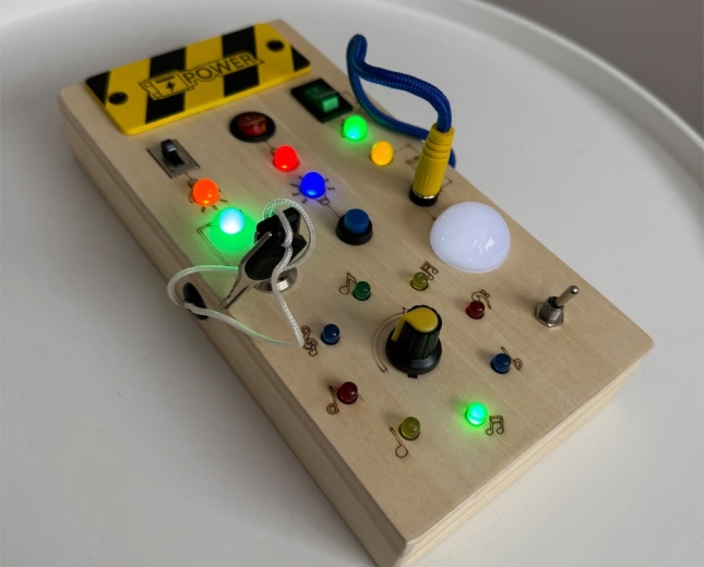 De plank is gemaakt van natuurlijk hout en multiplex, alle randen zijn glad afgewerkt. De LED’s zijn vriendelijk voor de ogen en de elementen zijn afgestemd op kinderhanden.