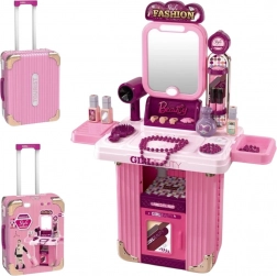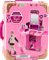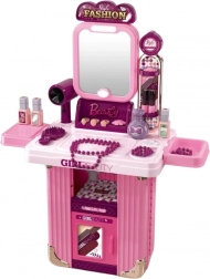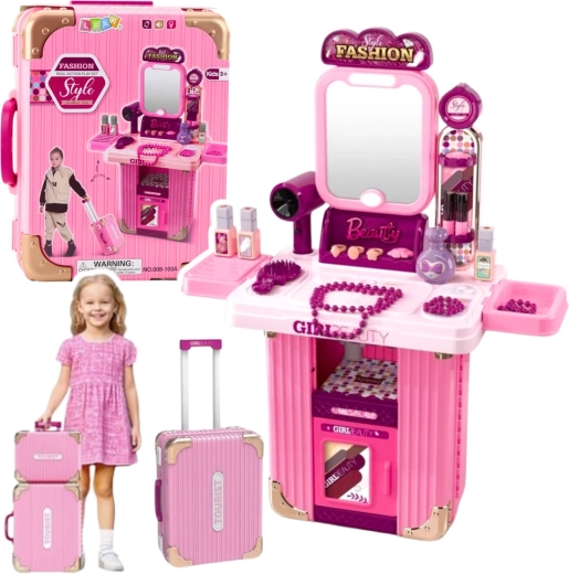 Stijlvolle 2-in-1 kinder-toiletset in een praktische koffer die na uitklappen verandert in een magische kaptafel. Voorzien van een verlichte spiegel, geluidseffecten en een rijk assortiment accessoires voor het spelen van schoonheidsalon. Licht en mobiel dankzij wieltjes en een uitschuifbare handgreep, gemaakt van veilige materialen – stimuleert creativiteit, verbeelding en fijne motoriek.