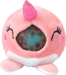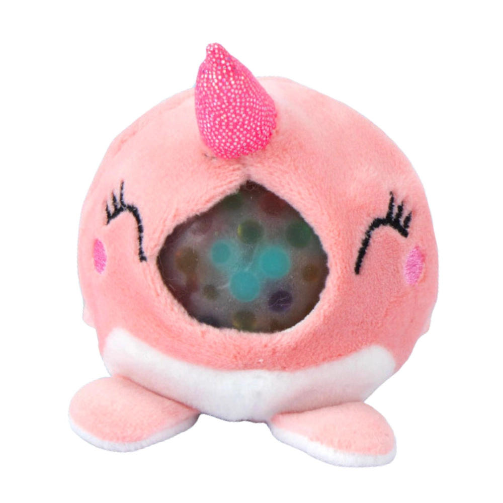 Schattige knijpbare pluche met een sensomotorische functie combineert een zachte pluchen knuffel met een ontspannende squishy. In het buikje zit een transparant venstertje met waterkralen die bij het knijpen een prettig gel-effect geven. De compacte afmeting van 6 cm past ideaal in de hand, rugzak of broekzak.