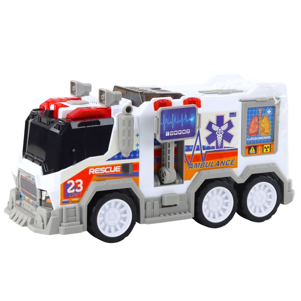 Realistische stadsambulance voor kinderen brengt de wereld van hulpverleners rechtstreeks naar de kinderkamer. Biedt licht- en geluidseffecten, frictieaandrijving (duwaandrijving) en openende deuren en kleppen voor nog echter speelplezier. Gemaakt van duurzaam en veilig kunststof, stimuleert de fantasie en fijne motoriek.