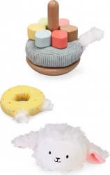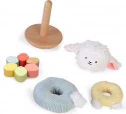 Een schattig schaapje nodigt kinderen uit om kleuren, vormen en texturen te ontdekken. De houten basis met pin, zachte textiele ringen en pluche kop ondersteunen de fijne motoriek, oog-handcoördinatie en herkenning van vormen en maten. De stabiele uitvoering en aangename materialen zijn ideaal voor kleine kinderhanden.