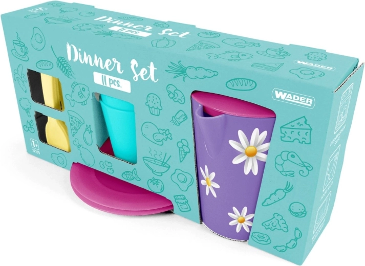 De kleine dinerset Party Time is ideaal voor kleine koks die dol zijn op koken en het organiseren van kinderfeestjes. De set bevat een kannetje met IML-graphics met schattige madeliefjes, 2 kopjes, 2 bordjes, 2 vorken, 2 messen en 2 lepeltjes – in totaal 11 onderdelen. Dankzij de elegante verpakking is de set ook perfect als cadeau.