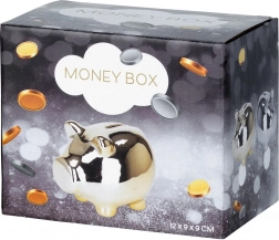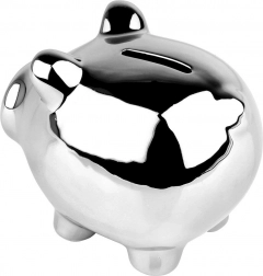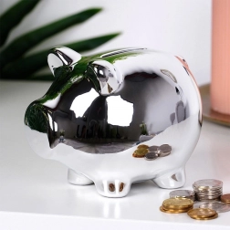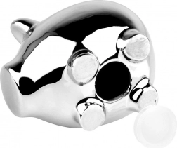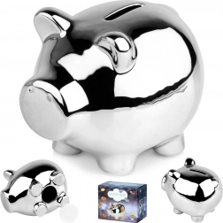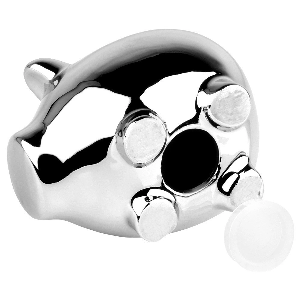 Elegante spaarpot in de vorm van een biggetje met een glanzend zilverkleurig spiegeloppervlak van keramiek. De praktische afneembare onderdop maakt het mogelijk om te sparen geld te verwijderen zonder te breken. De compacte afmetingen 11,5 × 9 × 9 cm en het moderne design maken van de spaarpot een stijlvol decoratief accessoire en een geweldig cadeau voor zowel kinderen als volwassenen.