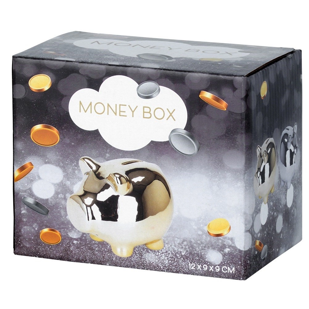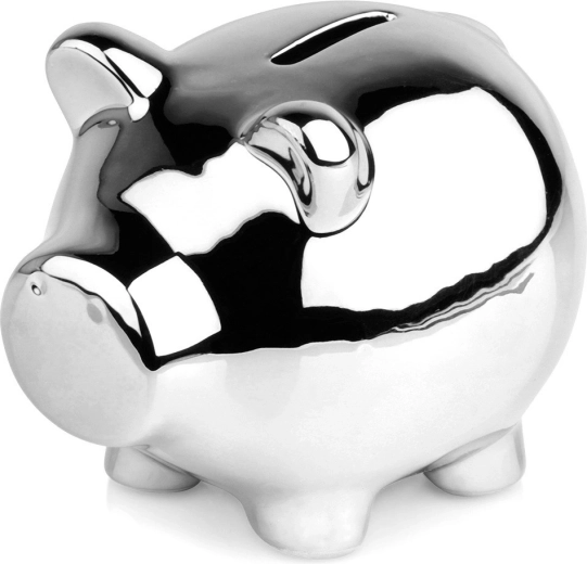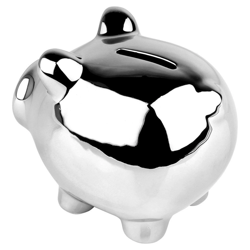 De stijlvolle zilverkleurige spaarpot in de vorm van een biggetje is ideaal voor het bewaren van munten en bankbiljetten. De glanzende spiegelafwerking geeft ieder interieur een moderne touch en past perfect bij een elegante glamourstijl. De opening aan de onderkant met sluiting maakt het gemakkelijk om spaargeld te verwijderen zonder de spaarpot te hoeven breken.