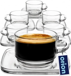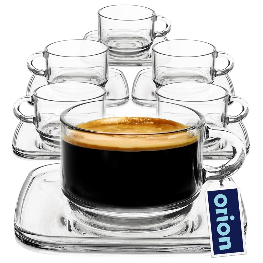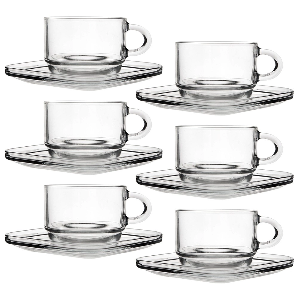 Elegante set van zes glazen kopjes met vierkante schoteltjes van 250 ml voor dagelijks serveren van koffie, thee en kruidendranken. Gemaakt van hoogwaardig helder glas dat de kleur van de drank prachtig laat uitkomen. De kopjes hebben een ergonomisch oor voor comfortabel vasthouden, moderne vierkante schoteltjes voor stabiliteit en stijl en zijn geschikt voor de vaatwasser voor eenvoudig onderhoud.