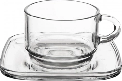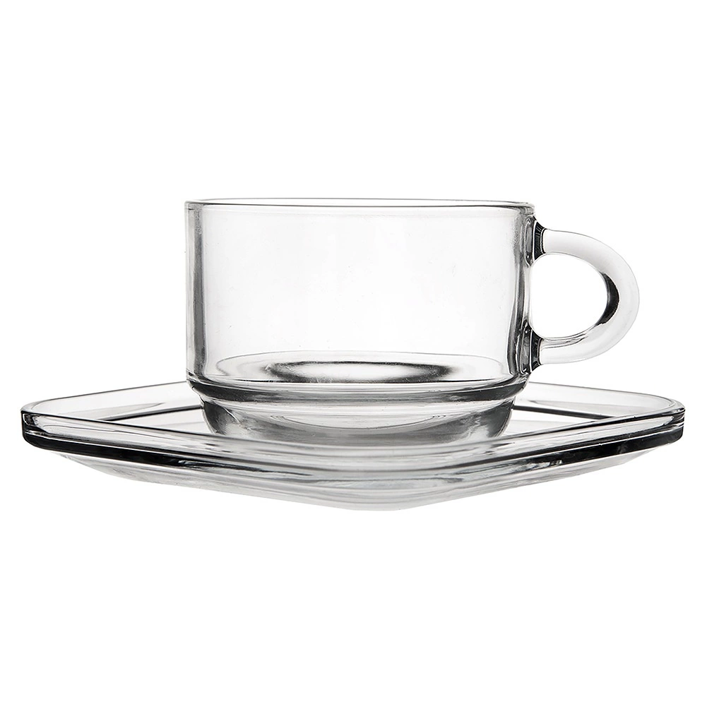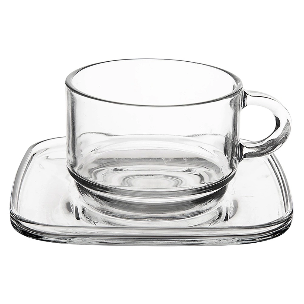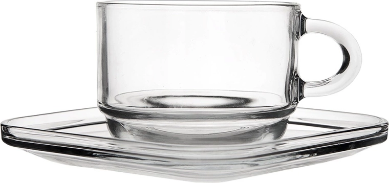 - Modern uiterlijk: helder glas en een hoekig schoteltje voor stijlvol serveren.