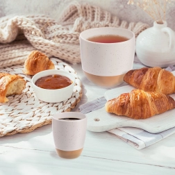 Stijlvolle keramische espressokop van 90 ml met een tweekleurig design: een witte, gespikkelde glazuur en een natuurlijke steengoedbodem. Dankzij de ergonomische vorm, dikkere wanden voor betere warmteisolatie en geschikt voor vaatwasser en magnetron is hij ideaal voor dagelijks gebruik en een elegante aanvulling op je tafelservies.