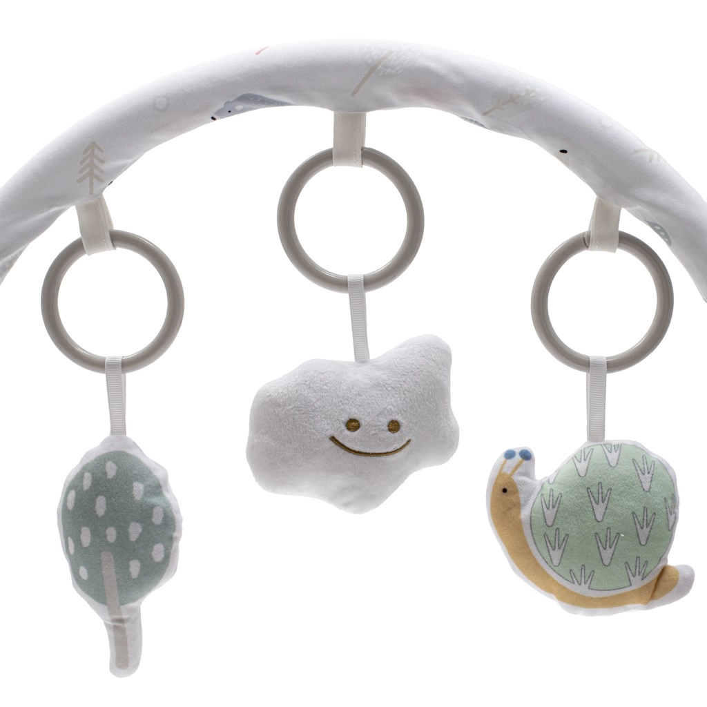 De afneembare speelboog met drie zachte speeltjes ondersteunt de coördinatie en zintuiglijke ontwikkeling. Eenvoudig te verwijderen voor het voeden of slapen.