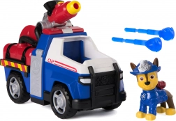 Held CHASE staat klaar om te redden! De authentieke politiehond uit PAW PATROL met helm en uniform zit in zijn eigen reddingsvoertuig, uitgerust met een werkend waterkanon. Gewoon laden en drukken – en de actie kan beginnen. De robuuste afwerking en vrij draaiende wielen zorgen voor soepel rijden over de vloer.