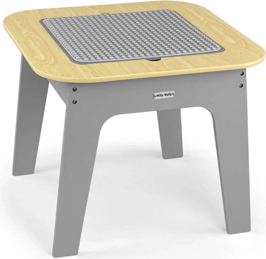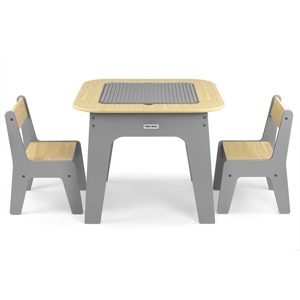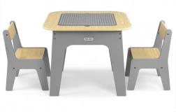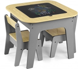 De praktische kinderset MILLY MALLY Olaf Blocks omvat een tafel en twee stoeltjes met een elegante combinatie van hout en grijs. De tafel heeft een dubbelzijdig blad – de ene kant is een , de andere een glad krijtbord om op te tekenen. Onder het blad vind je een ruime opbergbak voor speelgoed en benodigdheden. Afgeronde randen, een stabiele MDF-constructie en eenvoudig onderhoud zorgen voor veilig en comfortabel gebruik voor kinderen.