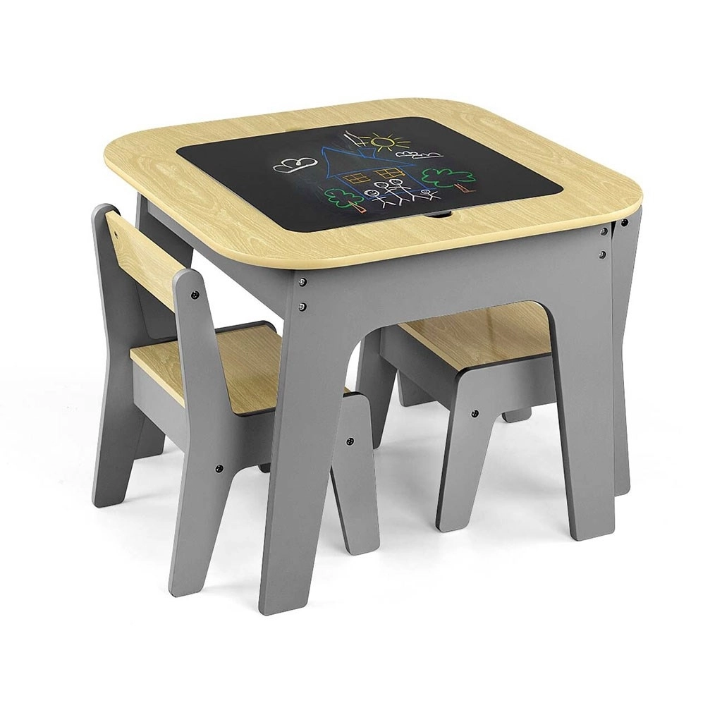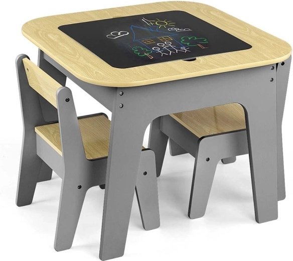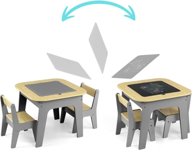 Ontdek een multifunctionele set die kinderen een creatieve ruimte biedt om te spelen, tekenen en leren. Het dubbelzijdige tafelblad is eenvoudig uitneembaar: de ene kant biedt een gestructureerd oppervlak voor bouwen met blokjes, de andere kant fungeert als krijtbord. Onder het blad bevindt zich een slimme opbergruimte die helpt de kinderkamer netjes te houden.