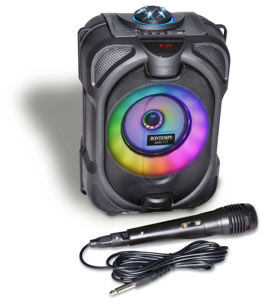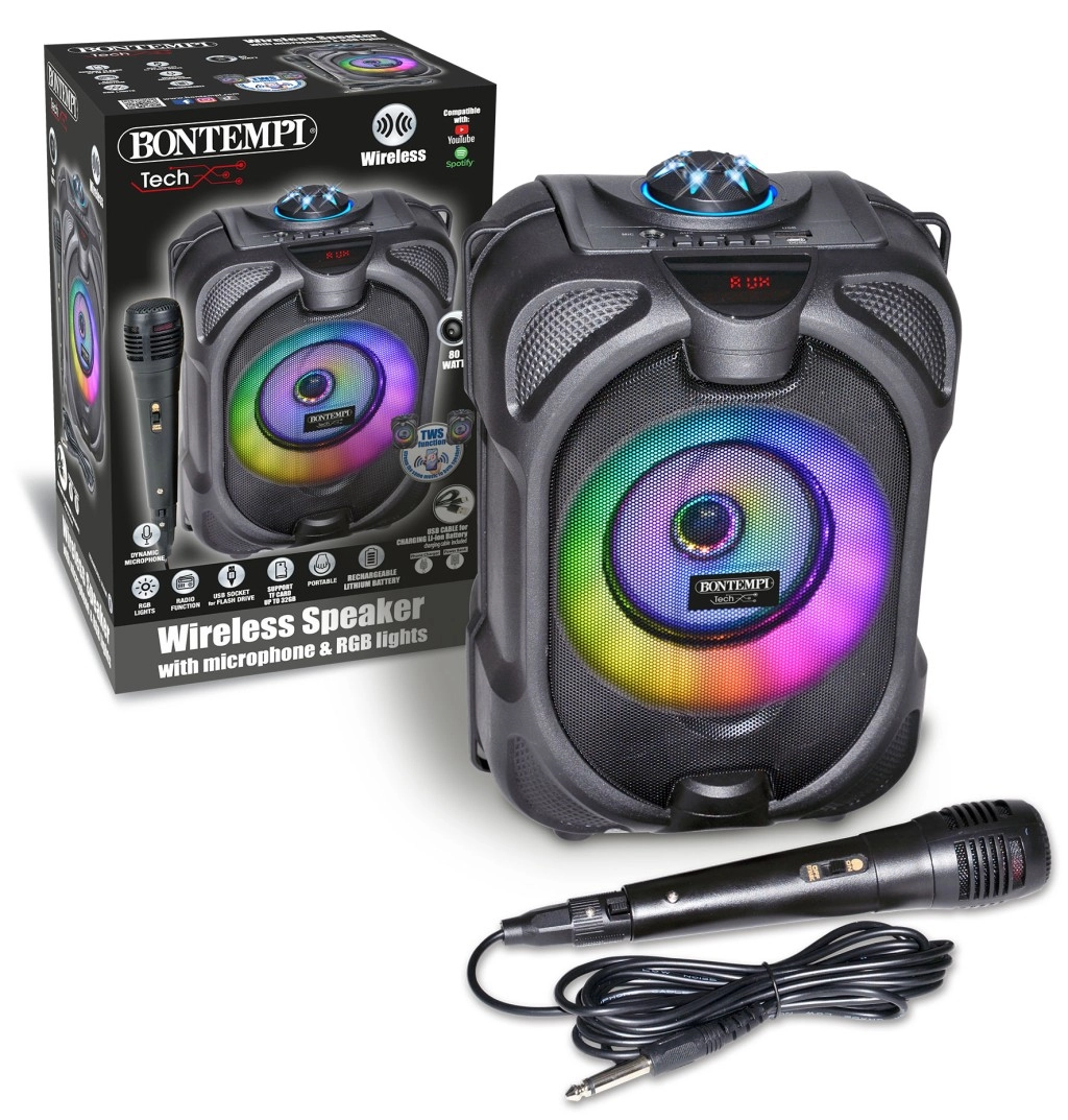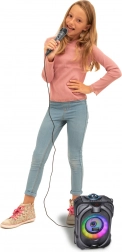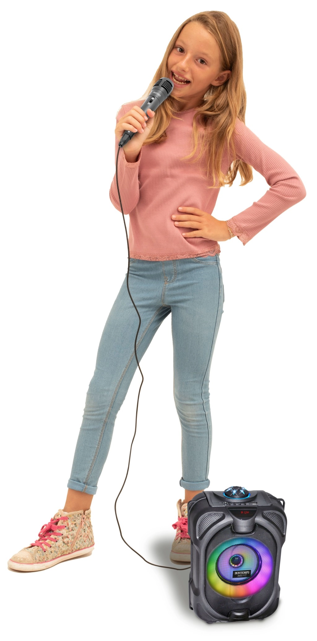 Geniet overal van plezier met deze draadloze karaoke-luidspreker met dynamische microfoon, kleurrijke lichteffecten en een geïntegreerd display. Eenvoudige verbinding via Bluetooth, hoogwaardige geluidskwaliteit en geschikt voor binnen en buiten maken dit de perfecte keuze voor familiefeesten, karaoke en thuisentertainment. Inclusief USB-C-oplaadkabel.