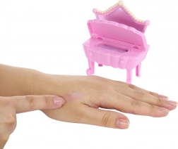 De roze kaptafel met deksel en versiering biedt een vakje voor kleine spulletjes. Kinderen kunnen lakjes, stickers en glossjes ordenen en zo hun eigen beautyhoekje creëren.