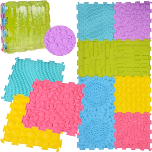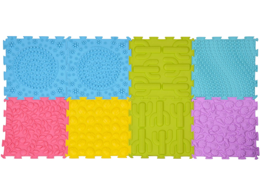 Elke tegel heeft een andere textuur (koepeltjes, blaadjes, schelpen, bloemen, cactussen) die de voetreceptoren activeert, de doorbloeding bevordert en de natuurlijke voetboog ondersteunt.