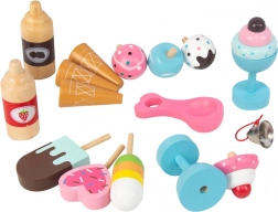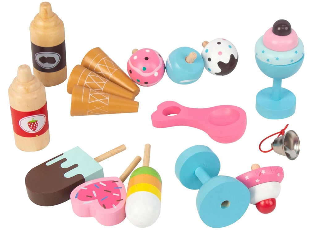 - Rijke set accessoires: 2 flessen siroop (aardbei, chocolade), 2 bekers, 3 ijsbollen, 2 ijsbollen op stokje, 3 hoorntjes, 3 ijsjes, 1 ijslepel.