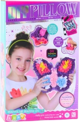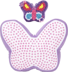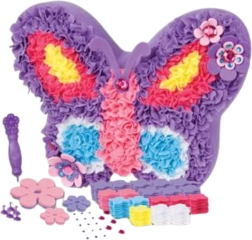 Met deze creatieve DIY-set kunnen kinderen hun eigen superzachte vlinderkussen maken zonder naalden of scherpe hulpmiddelen. Kleurrijke stukjes textiel worden eenvoudig in de vooraf gemarkeerde openingen gedrukt met een veilige kunststof tool, waardoor een reliëf 3D-patroon ontstaat.