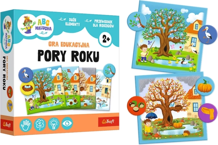 Ontdek spelenderwijs de wereld met het educatieve kinderspel Seizoenen uit de reeks ABC malucha met motieven van RODZINA TREFLIKÓW. Prachtig geïllustreerde kaartjes en fiches helpen kinderen te begrijpen wat er in de natuur verandert tijdens de lente, zomer, herfst en winter, terwijl ze tegelijk hun cognitieve vaardigheden, observatievermogen en logisch denken ontwikkelen.