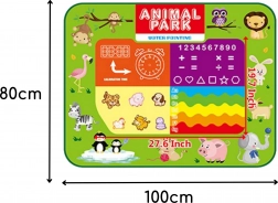 De Woopie Animal Park watertekenmat is ideaal voor kinderen vanaf 3 jaar. Dankzij de speciale watertechnologie teken je zonder inkt en verf – alleen met water, dus zonder vlekken en knoeien. De dubbelzijdige print biedt rijke inhoud om het alfabet, cijfers, vormen, dieren en basale wiskunde en kloklezen te oefenen. Het grote formaat 100 × 80 cm is perfect voor zelfstandig creëren of samen spelen met broers en zussen.