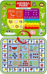 - Dubbelzijdig educatief design: alfabet, cijfers, dieren, oefeningen, klok en geometrische vormen.