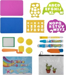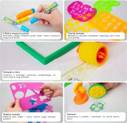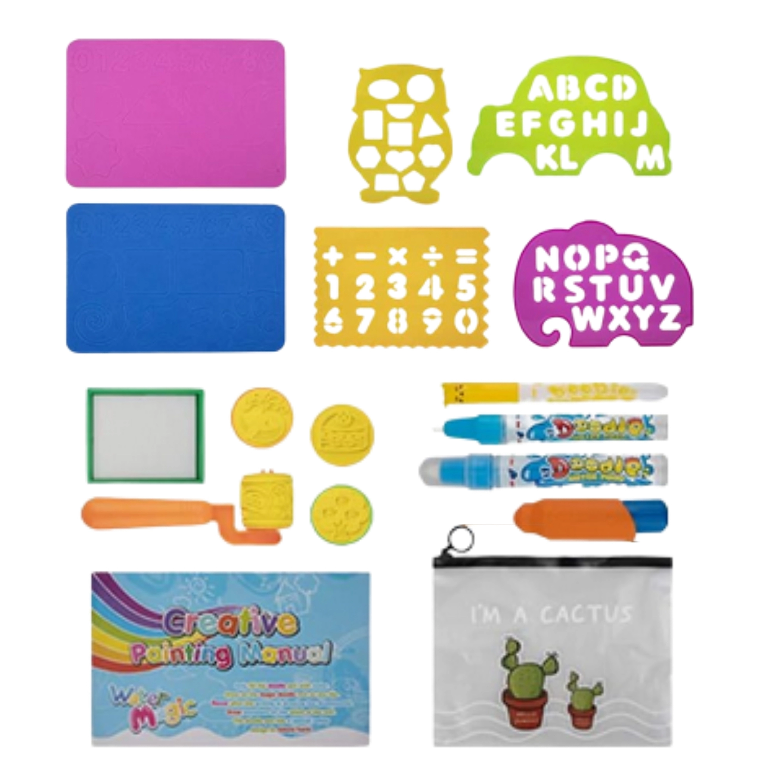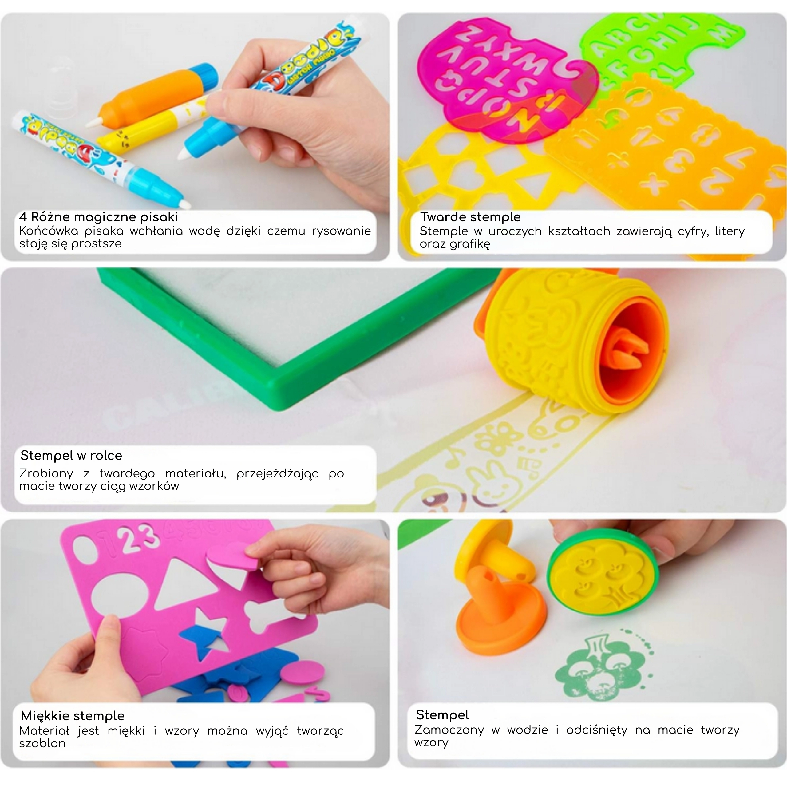 In de verpakking zitten 2 waterstiften, een rollertje met handgreep, 3 stempels en 2 educatieve sjablonen, die de creatieve mogelijkheden uitbreiden. De mat is licht, compact op te bergen en gemaakt van veilige, niet-giftige en gecertificeerde materialen. Gebruik thuis of in de tuin stimuleert creativiteit, oog-handcoördinatie en taalvaardigheid, allemaal in de vorm van spel.