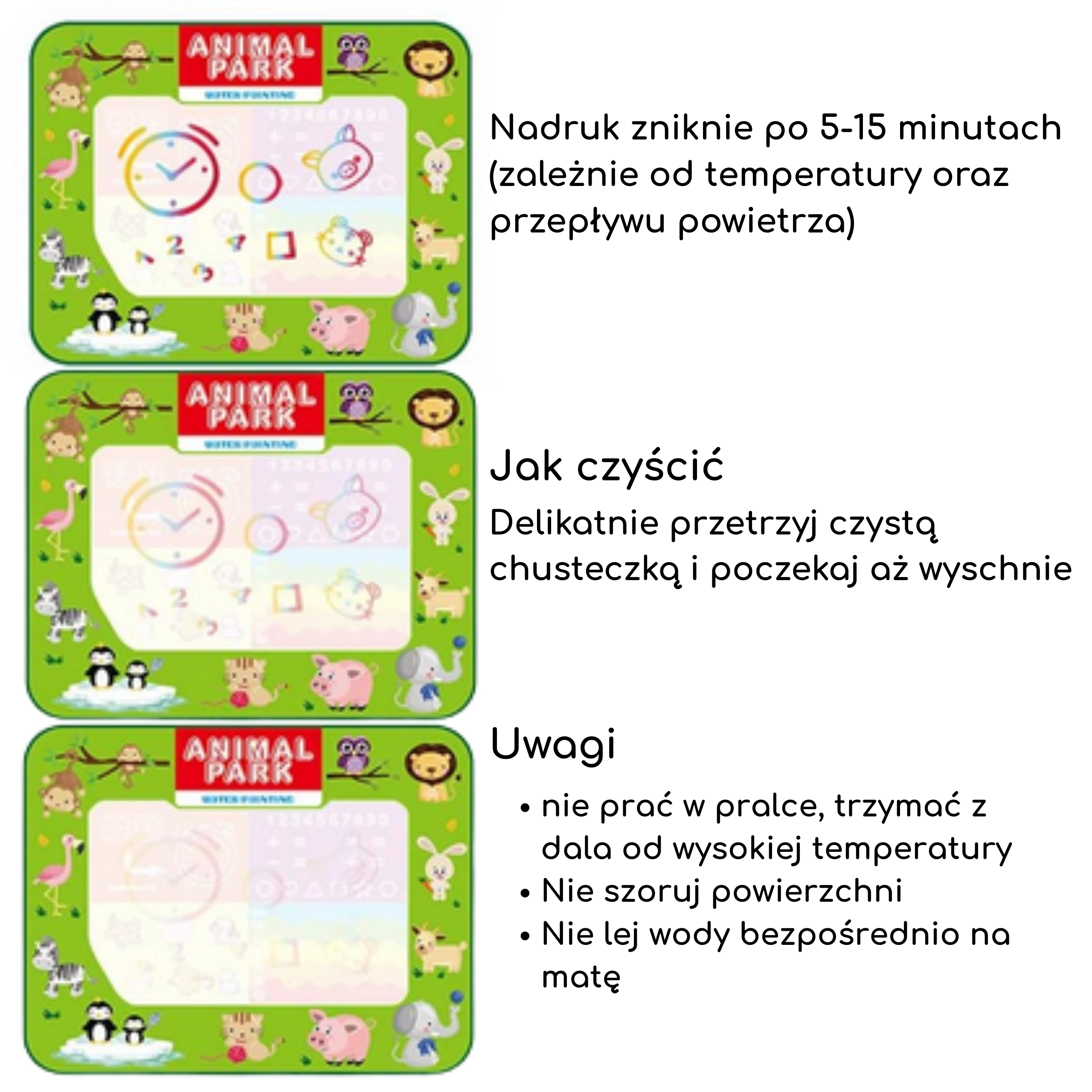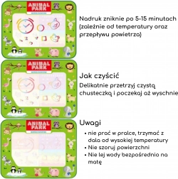 Ontdek de leuke en veilige Woopie Animal Park watertekenmat, die kinderen spelenderwijs laat leren zonder rommel. Het grote formaat van 100 × 80 cm en de dubbelzijdige educatieve print met alfabet, cijfers, vormen, dieren, oefeningen en een klok stimuleert creativiteit, fijne motoriek en logisch denken. De set bevat waterstiften, een rollertje, stempels en sjablonen; alleen water nodig – de mat is herbruikbaar en na het drogen weer klaar voor gebruik.