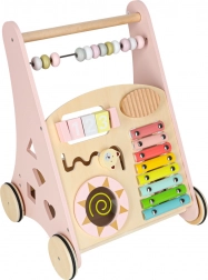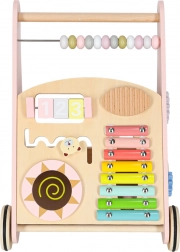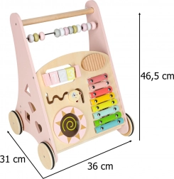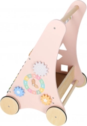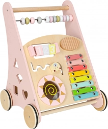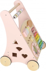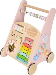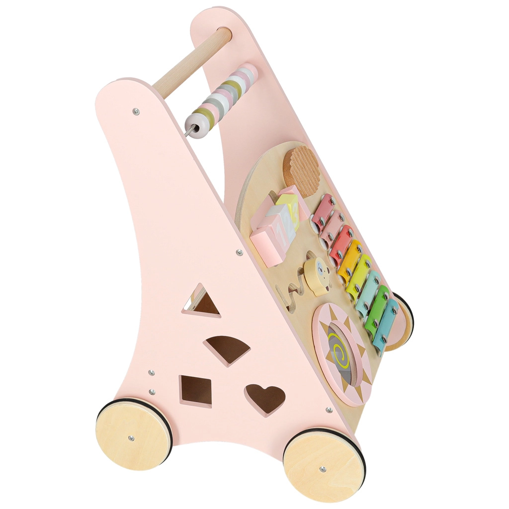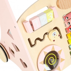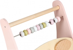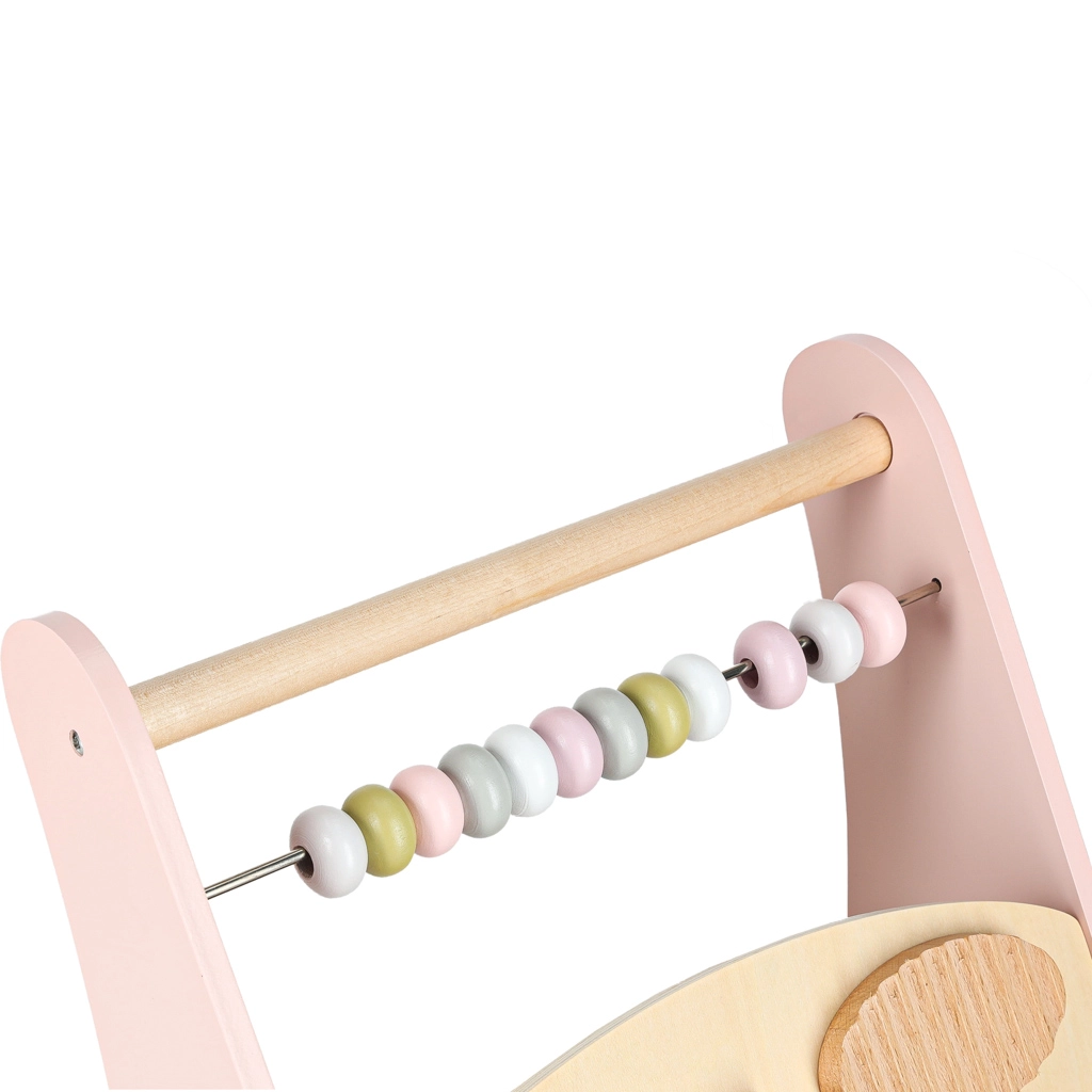 Houten duwwagen met telraam en activiteiten, roze