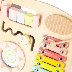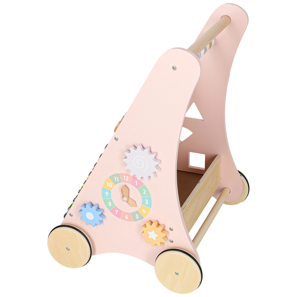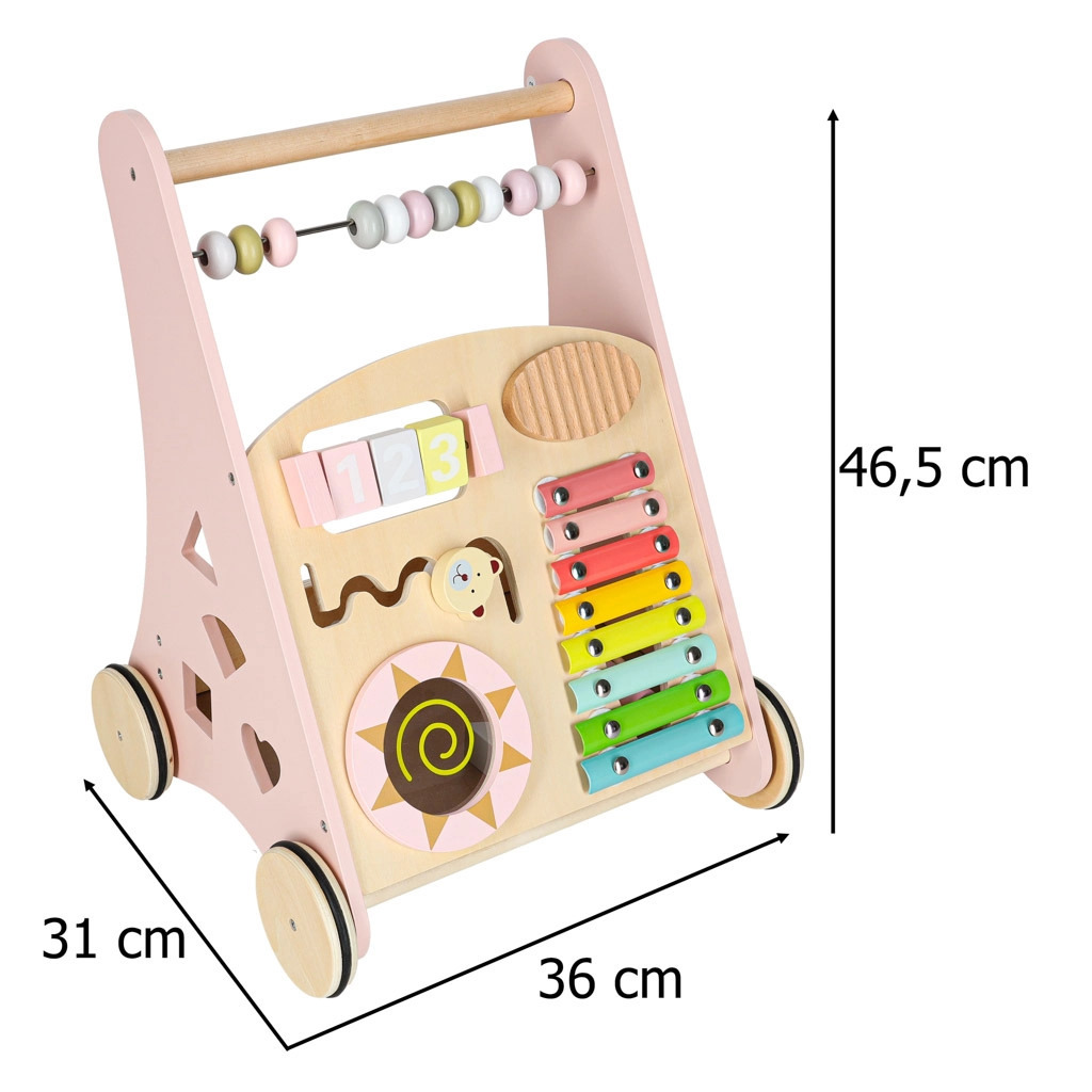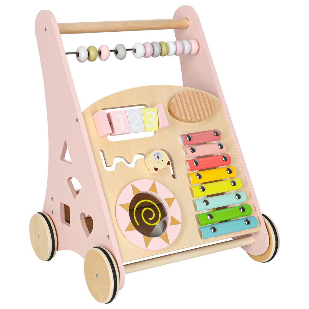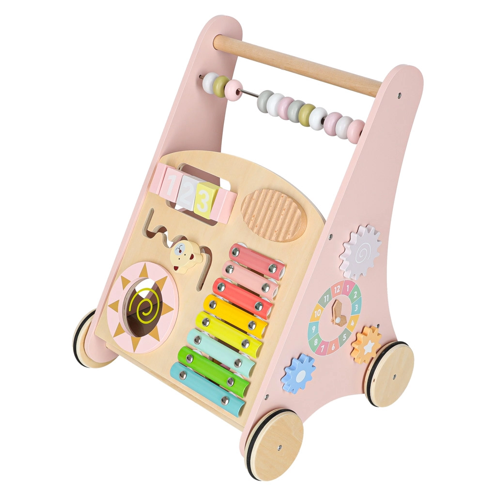 Deze stijlvolle houten loopwagen in pastelroze ondersteunt evenwicht, coördinatie en zelfvertrouwen tijdens het lopen. Het frontpaneel zit vol activiteiten: een telraam voor de eerste sommetjes, een xylofoon om klanken te ontdekken, tandwielen, een draaibare schijf, vormsorteren en schuifelementen die de fijne motoriek en concentratie bevorderen.