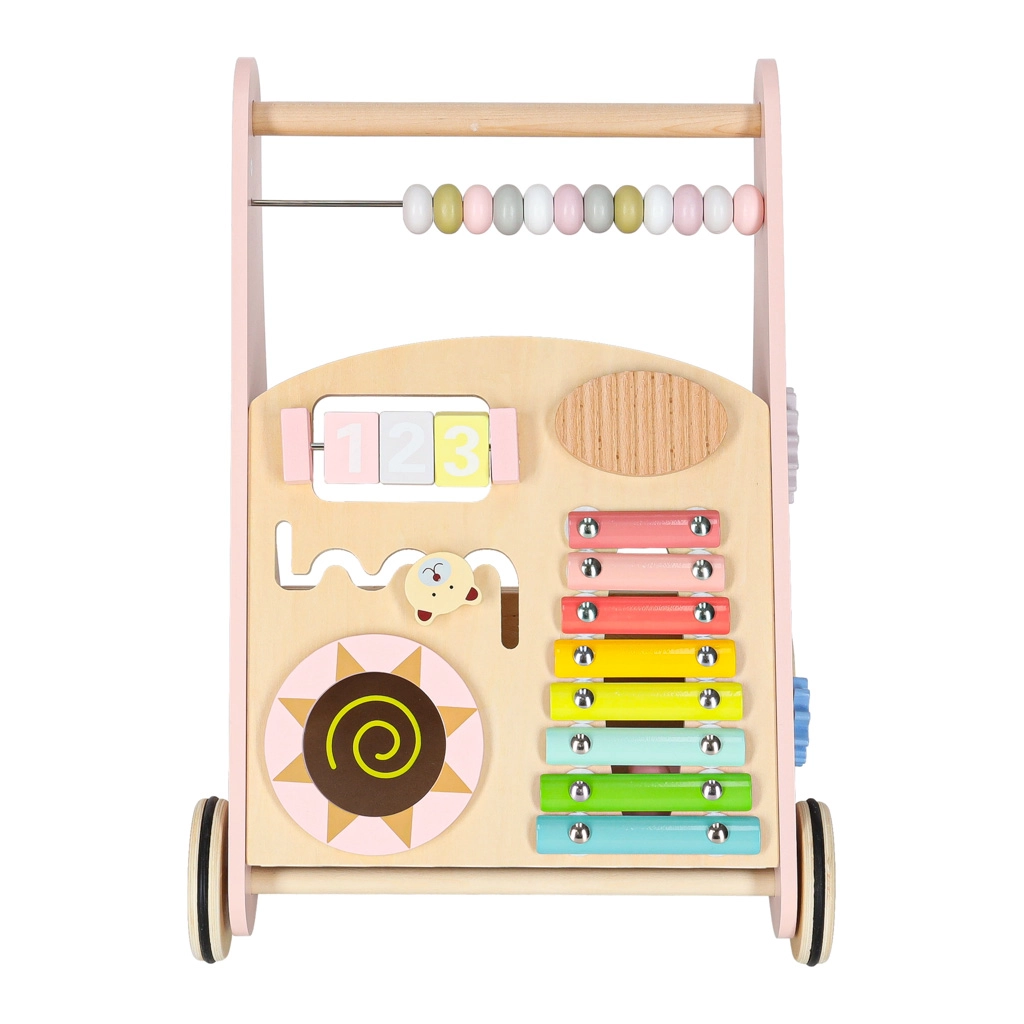 Ontdek de vreugde van de eerste stapjes met deze multifunctionele houten loopwagen. Biedt een stabiele ondersteuning bij het lopen en tal van activiteiten voor de motorische ontwikkeling: een telraam, xylofoon met stokjes, vormsorteren, draaielementen en schuifbanen. Pasteltinten en hoogwaardig hout garanderen veilig en duurzaam speelplezier, elke dag.