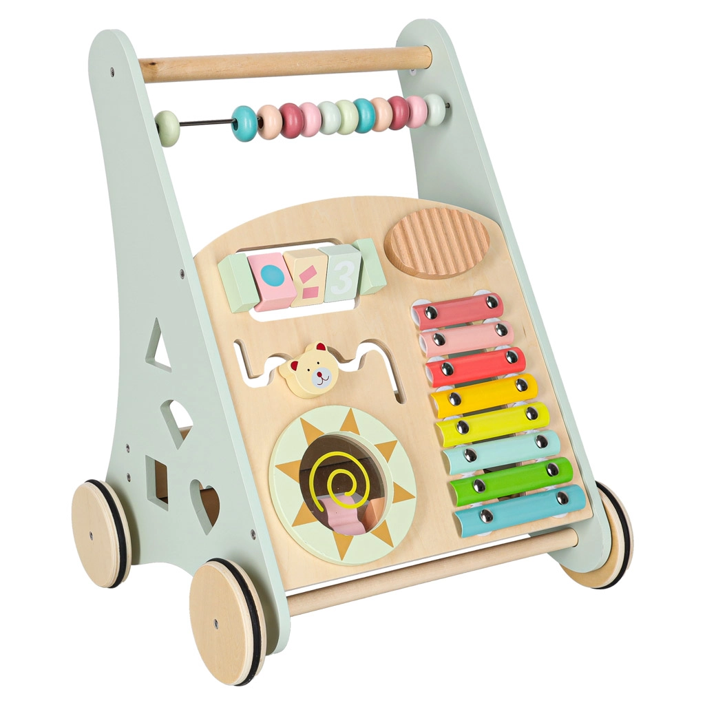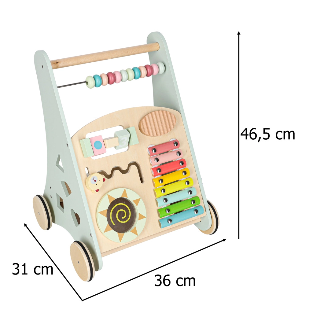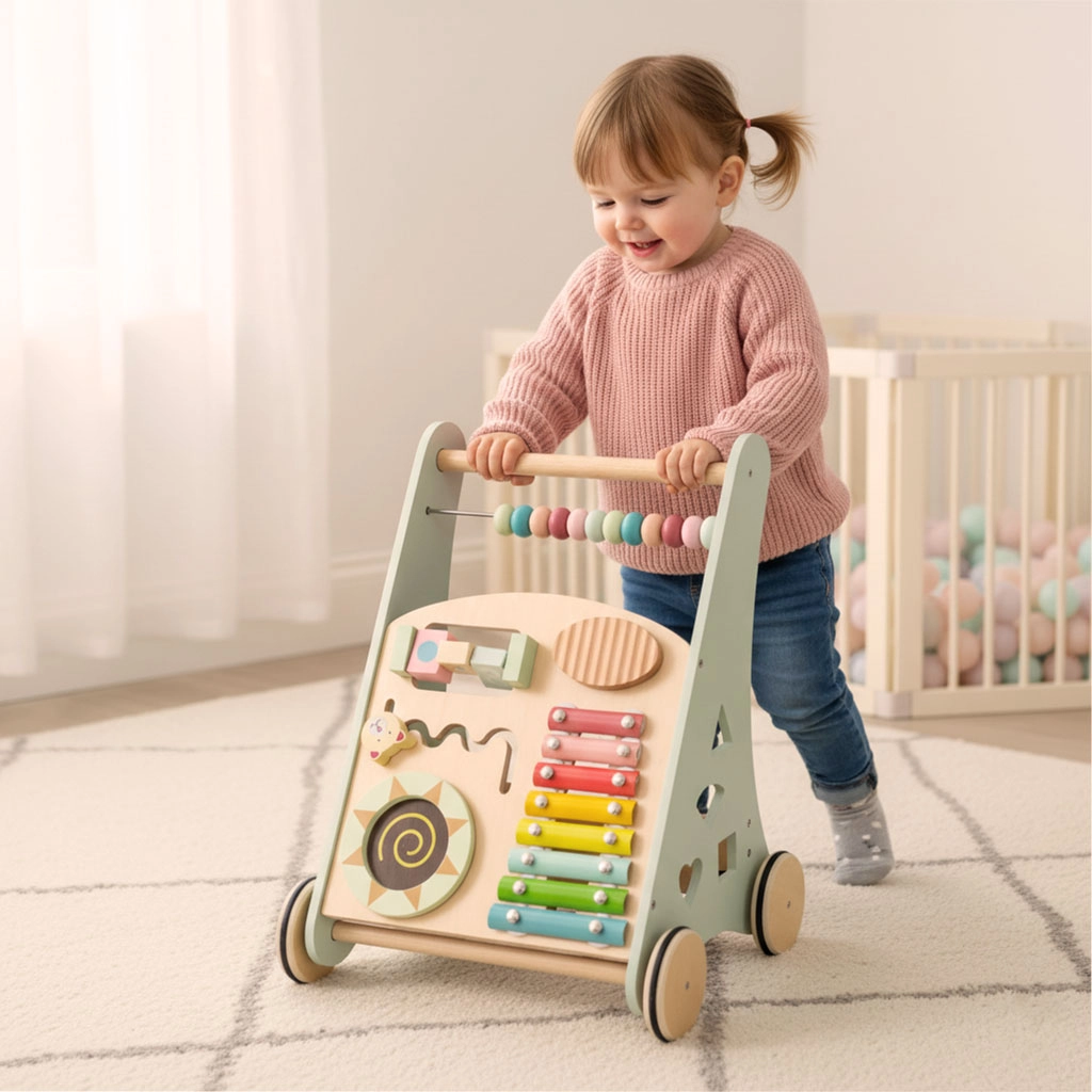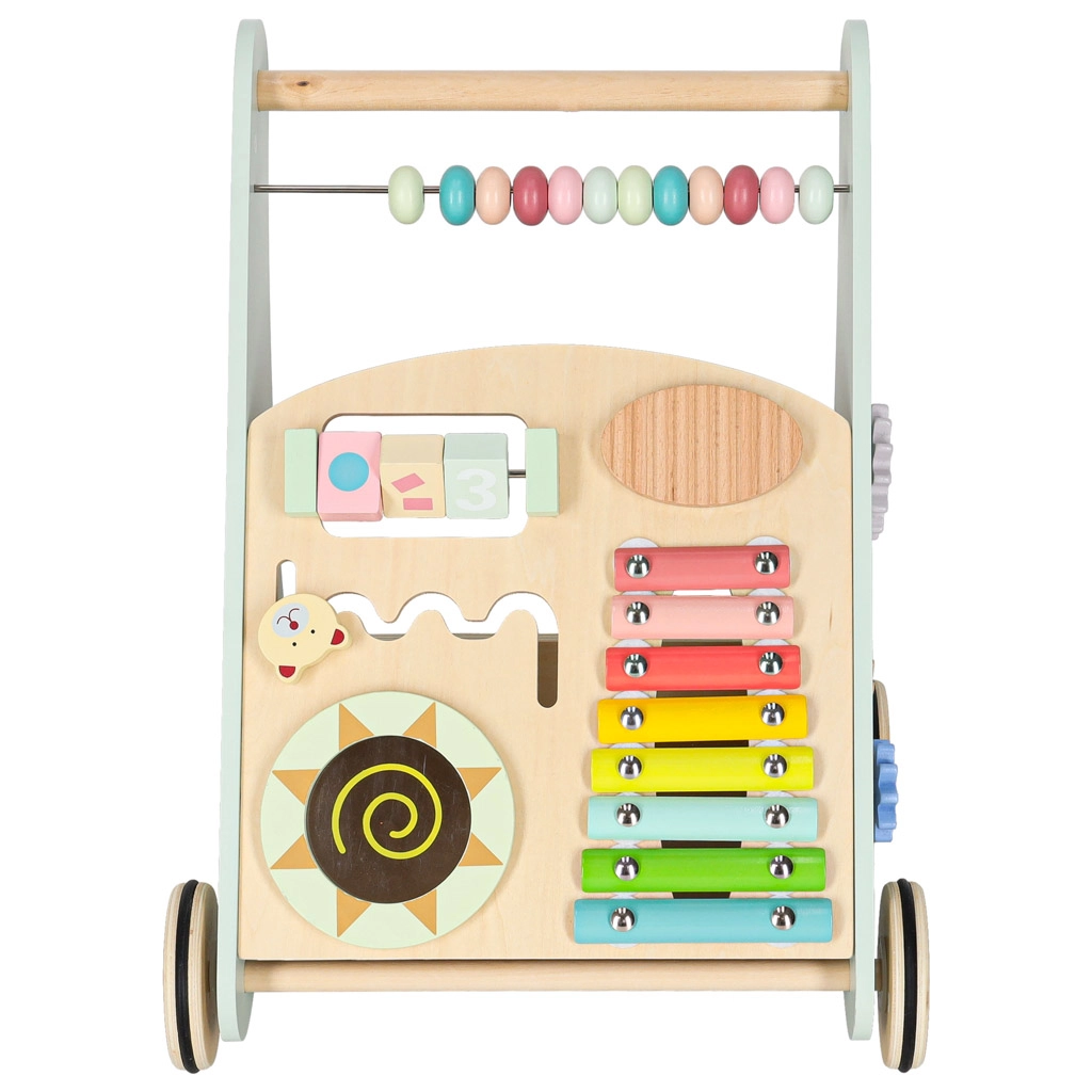 Stabiel houten loopwagentje met telraam en een rijk activiteitenpaneel helpt kinderen vanaf 12 maanden leren lopen en de wereld ontdekken. Biedt een xylofoon, telraam, vormenstoof, tandwielen, kralenlabyrint en klok. Dankzij de stevige constructie, rubberen wielen en veilige verf op waterbasis ontwikkelt het motoriek, zintuigen en logisch denken – en het plezier duurt echt lang.