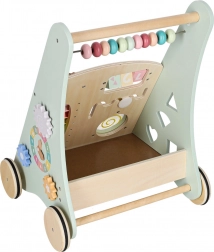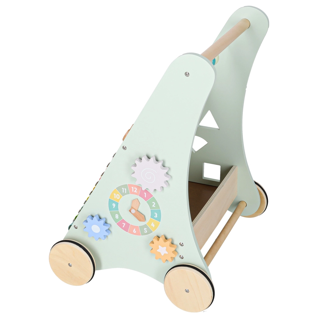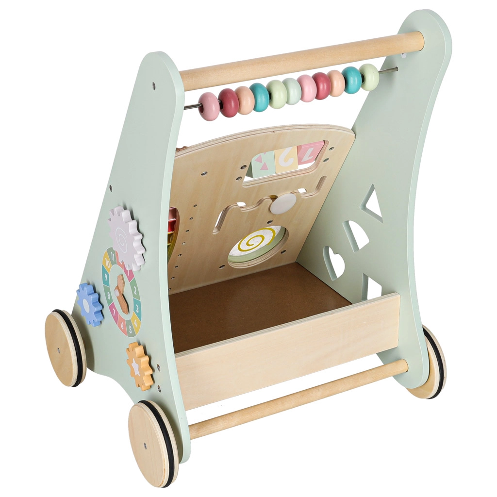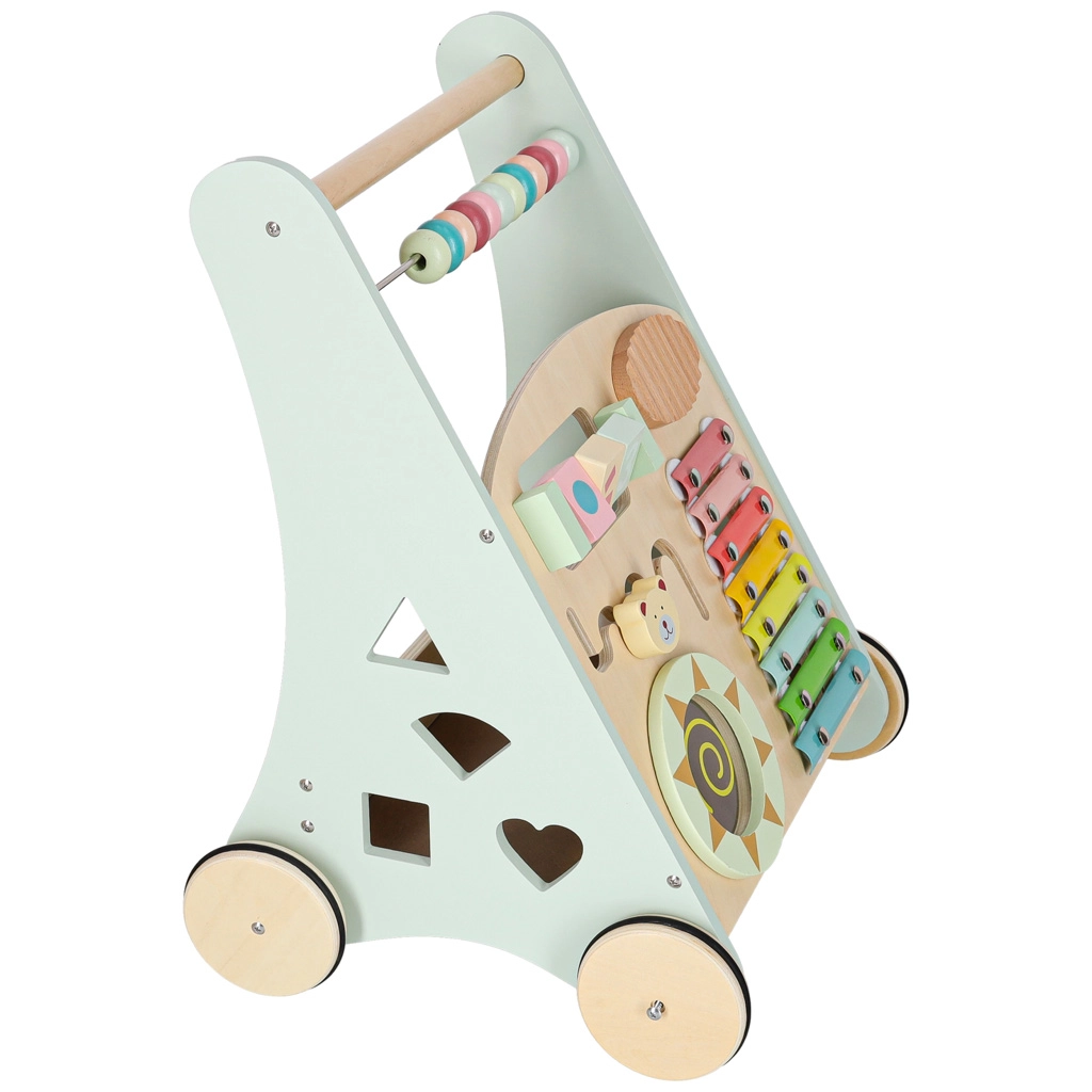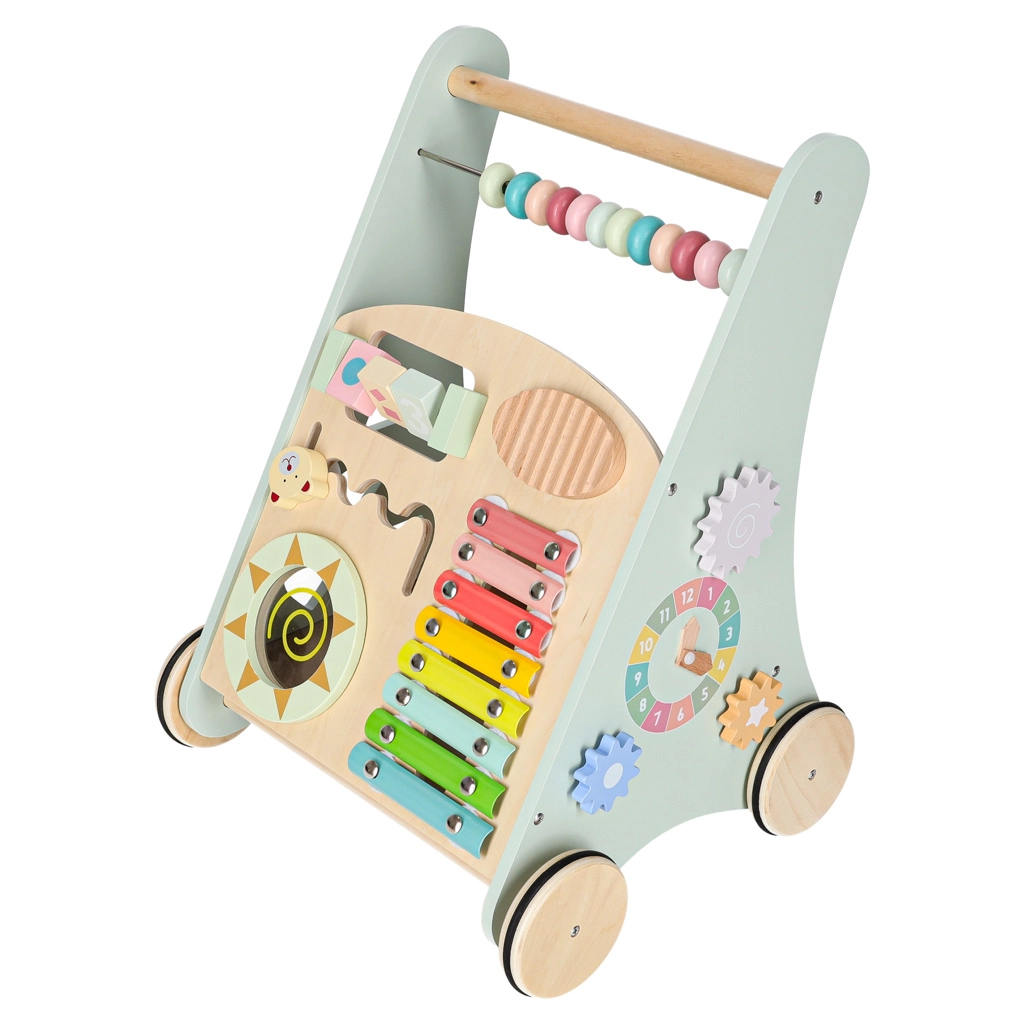 Stabiel houten loopwagentje met telraam en een rijk activiteitenpaneel helpt kinderen vanaf 12 maanden leren lopen en de wereld ontdekken. Biedt een xylofoon, telraam, vormenstoof, tandwielen, kralenlabyrint en klok. Dankzij de stevige constructie, rubberen wielen en veilige verf op waterbasis ontwikkelt het motoriek, zintuigen en logisch denken – en het plezier duurt echt lang.