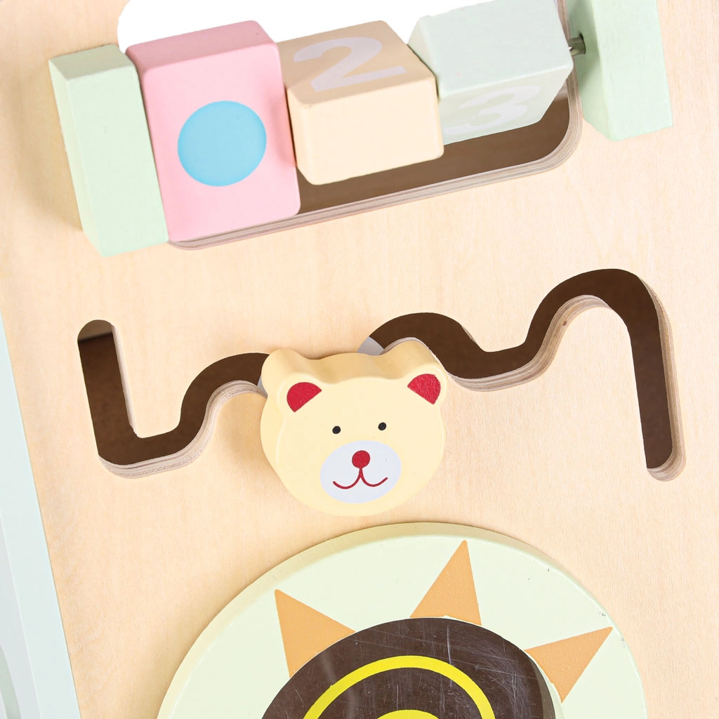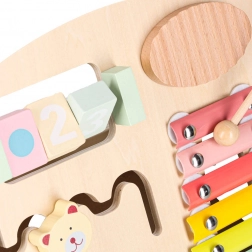 Op het frontpaneel vind je een xylofoon met stokjes, een telraam voor de eerste stapjes in rekenen en een vormenstoof om kleuren en vormen te leren. Tandwielen, een kralenlabyrint en een klok ontwikkelen logisch denken en begrip van oorzaak en gevolg. De rubberen wielbanden zorgen voor betere grip en een stille rit.