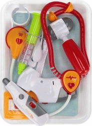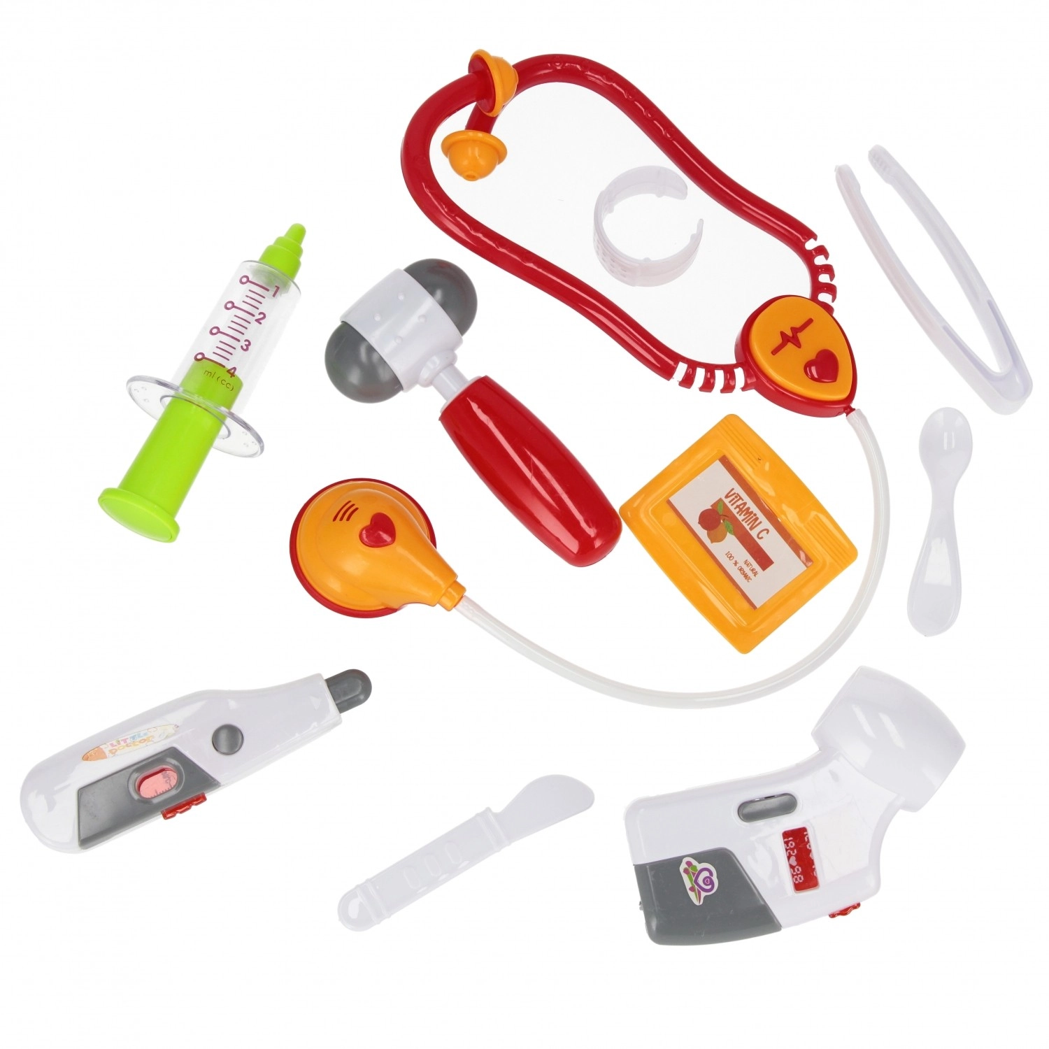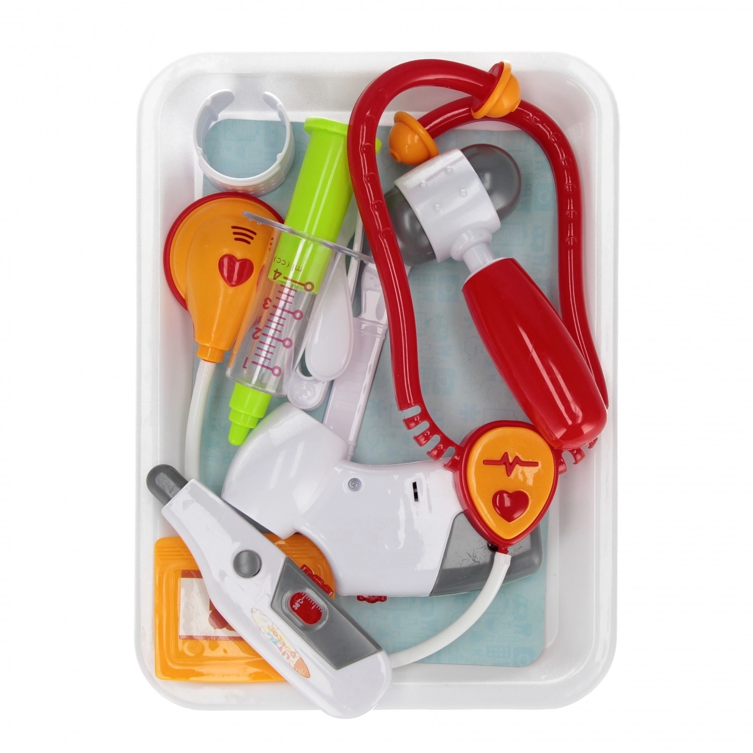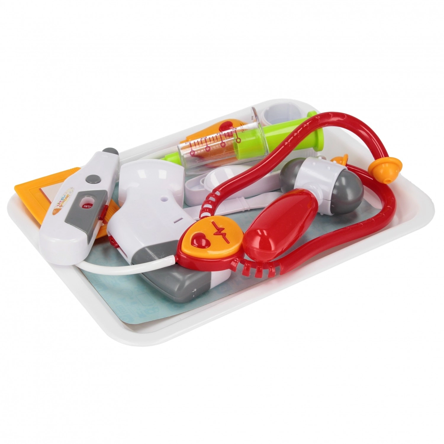De set bevat een dienblad, stethoscoop, spuit, pincet, pleister, mesje, lepeltje, reflexhamer, pulsoximeter, thermometer en identificatiekaart. Ideaal voor samen spelen met broers, zussen of vriendjes en om op een veilige, nagebootste manier kennis te maken met de medische omgeving.