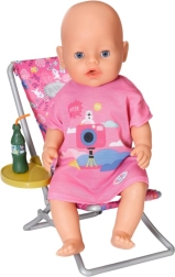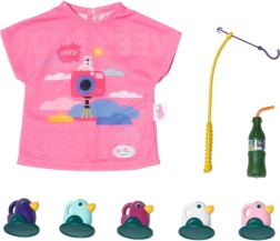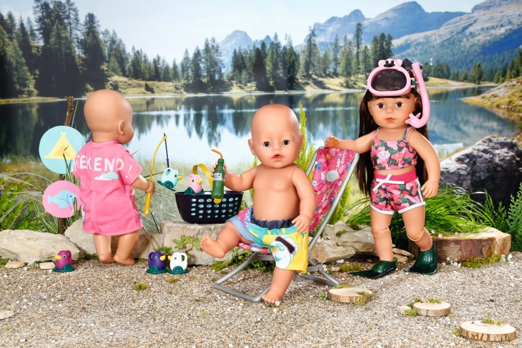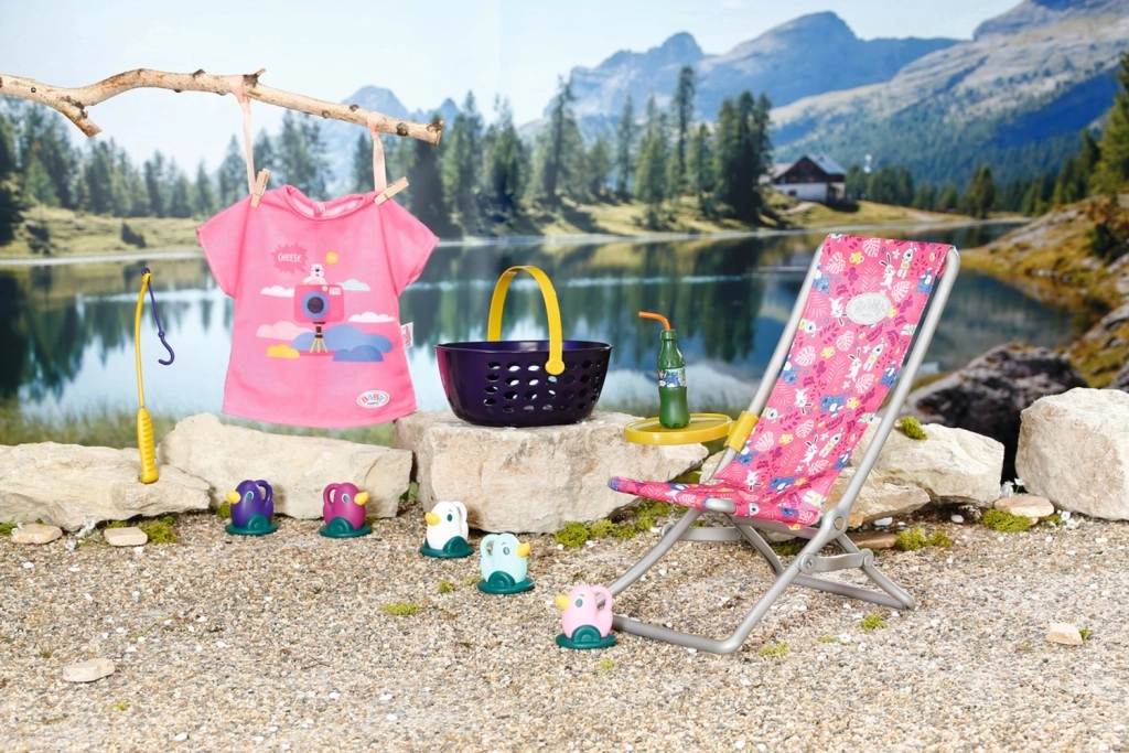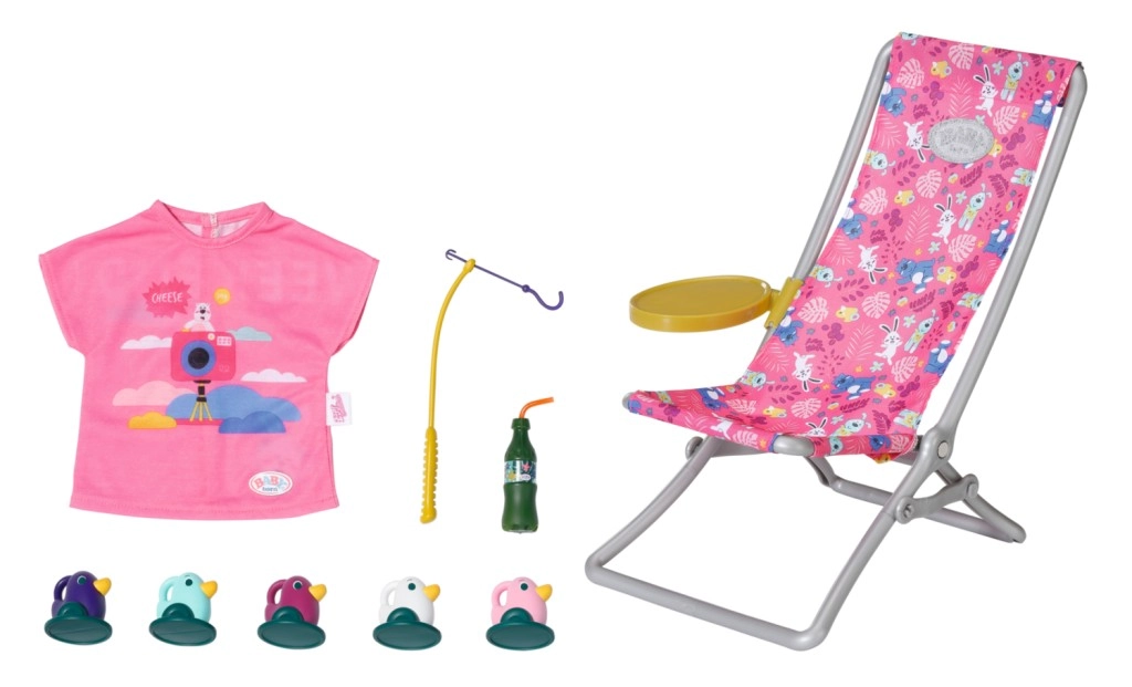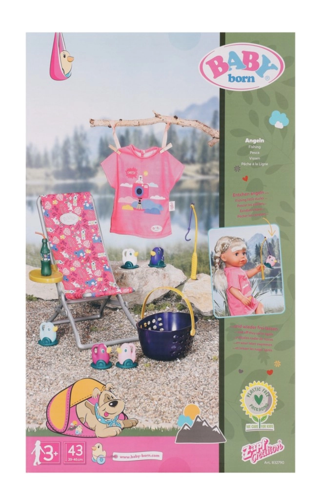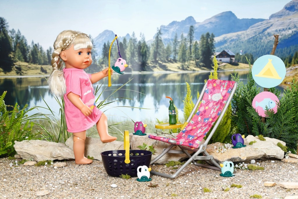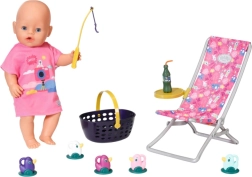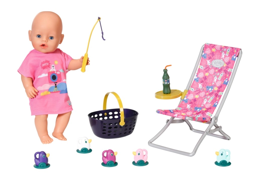 De BABY born Weekend-set voor vissen bevat een outfit, een ligstoeltje met tafeltje, een fles limonade, een mandje, 5 eendjes en een hengel.