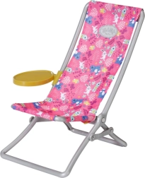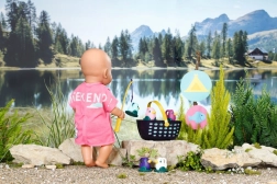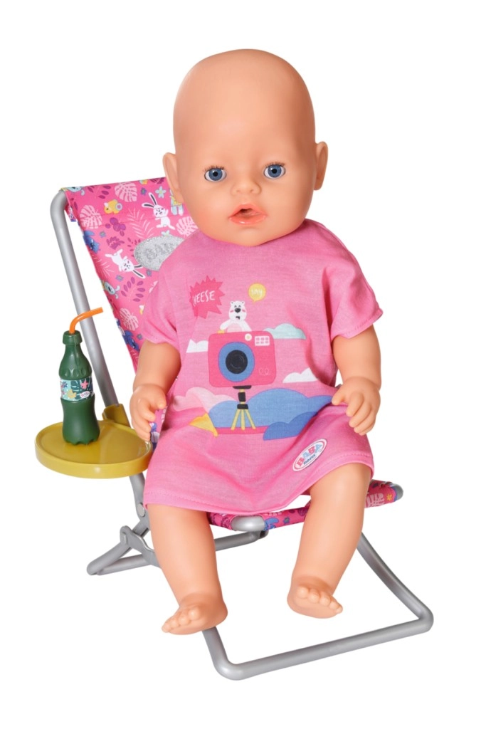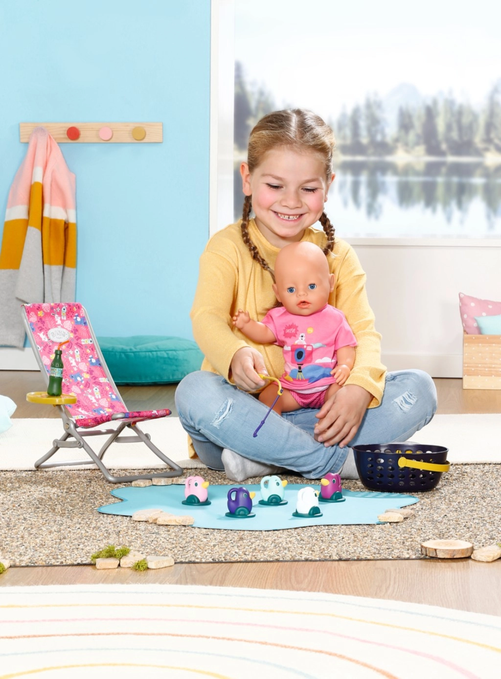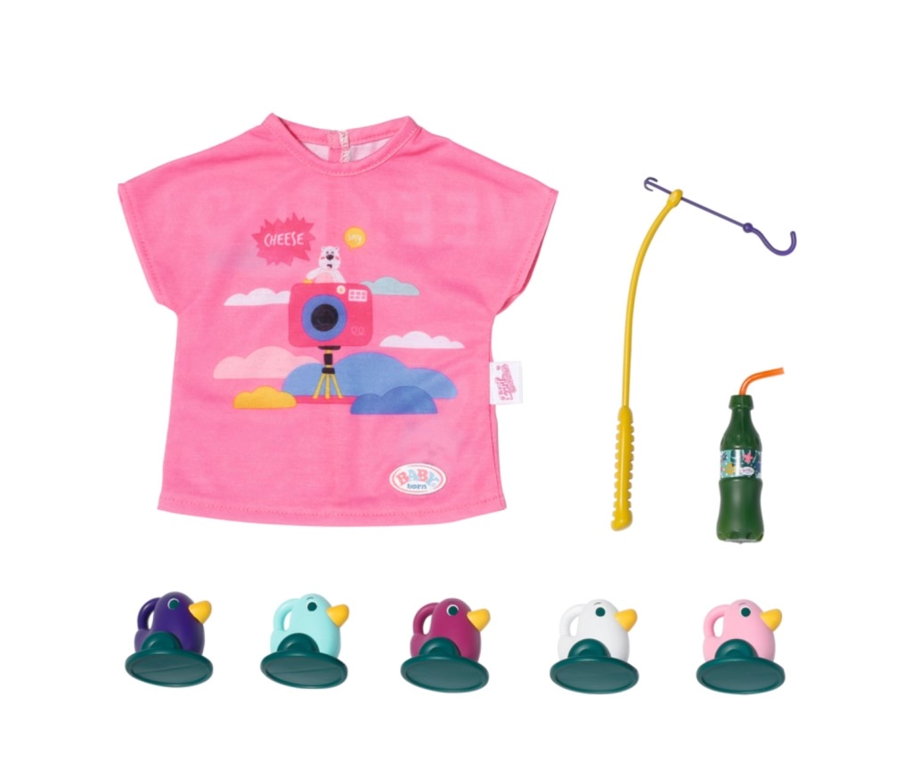 "In de zee zijn er veel meer vissen…" Maar BABY born vangt liever schattige eendjes. Terwijl ze comfortabel zit in een roze ligstoeltje met kleurrijk patroon, probeert ze met de haak van haar hengel een van de vijf eendjes te vangen. Af en toe neemt ze een slok limonade, die op het gele tafeltje naast het ligstoeltje staat. Wanneer ze alle eendjes heeft opgevist en in het blauwe mandje heeft gelegd, zet ze ze terug in de vijver en kan het leuke spel opnieuw beginnen. Voor dit visspel draagt BABY born een casual, lang roze T‑shirt met een schattige print.